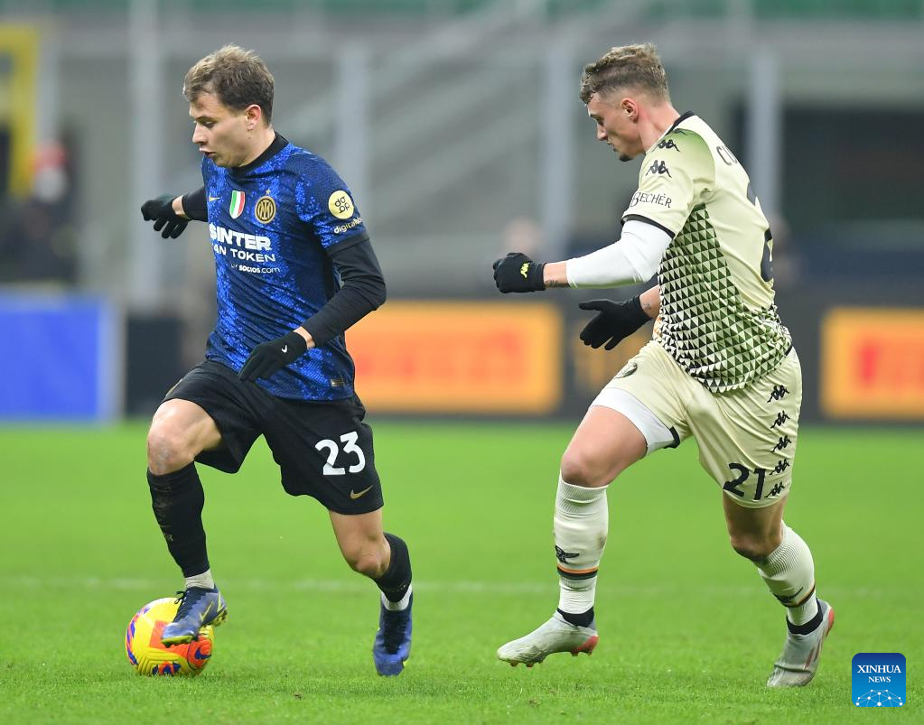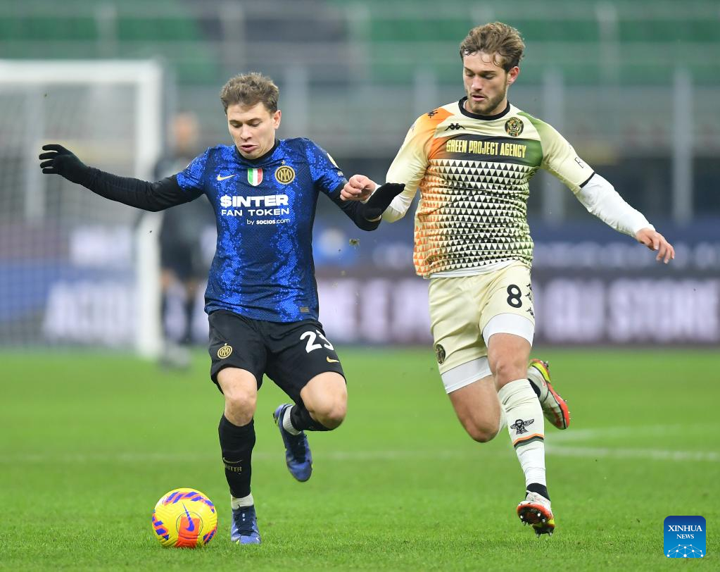 FC Inter's Nicolo Barella (L) vies with Venezia's Michael Cuisance during a Serie A football match between FC Inter and Venezia in Milan, Italy, on Jan. 22, 2022. (Str/Xinhua)