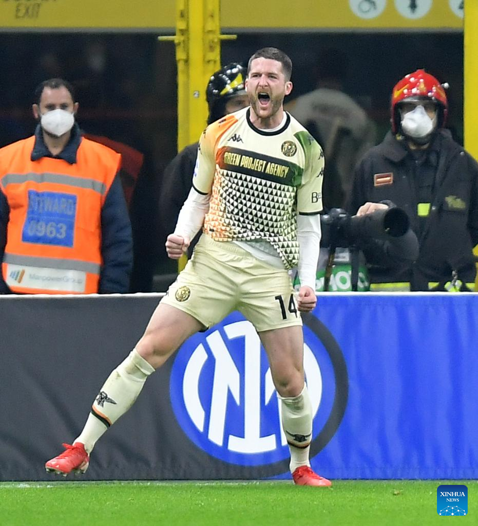 Venezia's Thomas Henry celebrates his goal during a Serie A football match between FC Inter and Venezia in Milan, Italy, on Jan. 22, 2022. (Str/Xinhua)