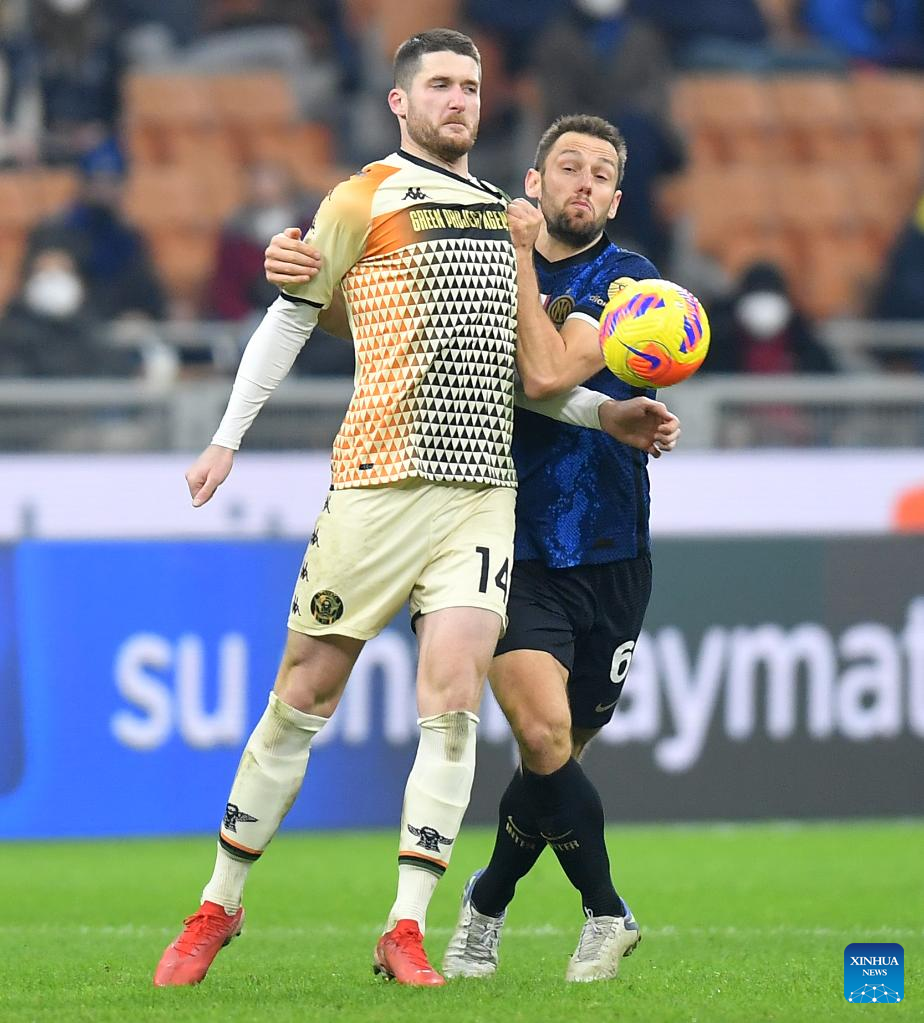 FC Inter's Stefan De Vrij (R) vies with Venezia's Thomas Henry during a Serie A football match between FC Inter and Venezia in Milan, Italy, on Jan. 22, 2022. (Str/Xinhua)