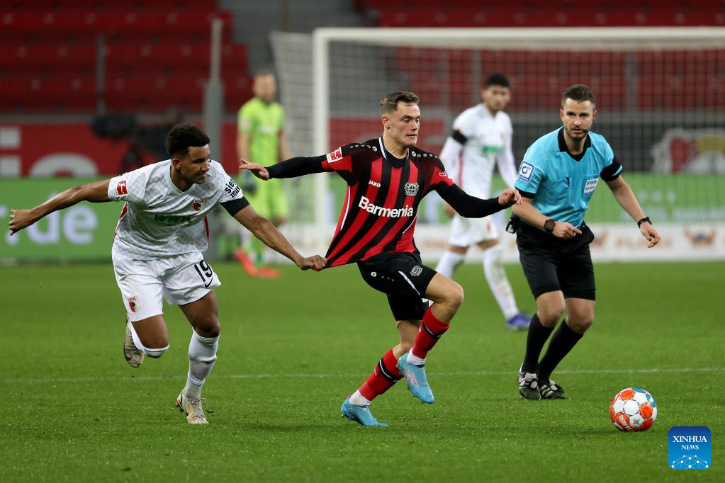 Florian Wirtz (front C) of Leverkusen vies with Felix Uduokhai of Augsburg during the German first division Bundesliga football match between Bayer 04 Leverkusen and FC Augsburg in Leverkusen, Germany, Jan. 22, 2022. (Photo by Joachim Bywaletz/Xinhua)