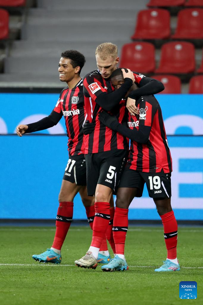 Moussa Diaby (1st R) of Leverkusen celebrates scoring with his teammates during the German first division Bundesliga football match between Bayer 04 Leverkusen and FC Augsburg in Leverkusen, Germany, Jan. 22, 2022. (Photo by Joachim Bywaletz/Xinhua)