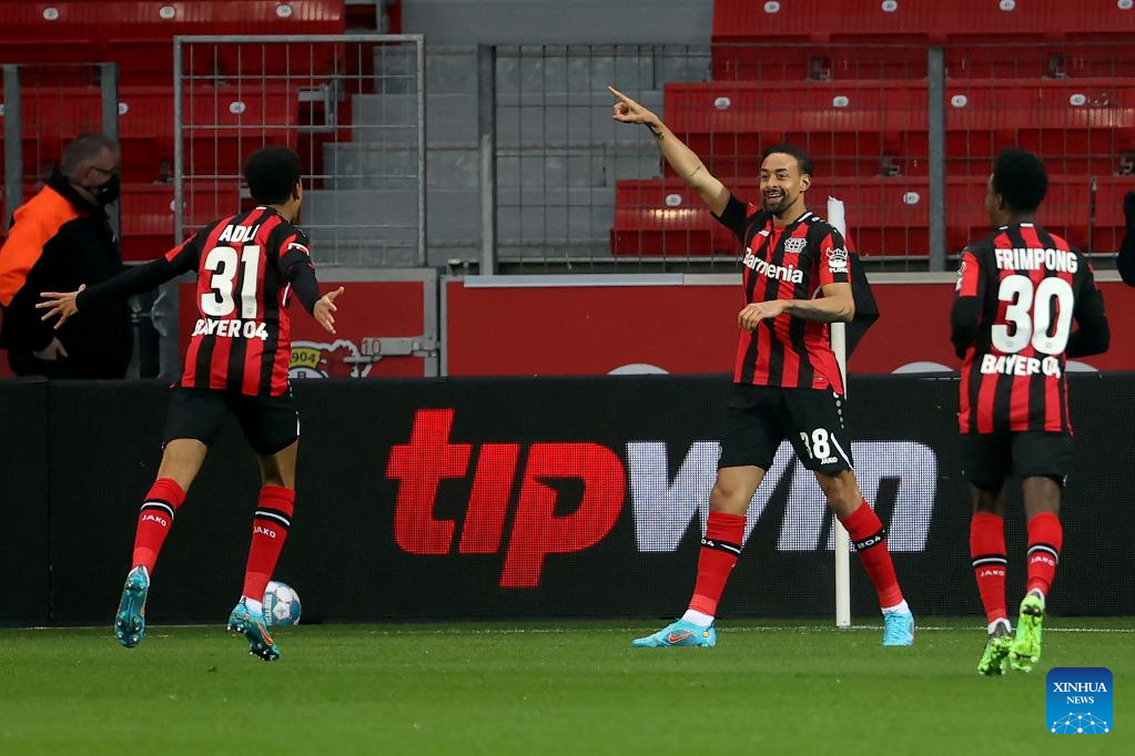 Karim Bellarabi (2nd R) of Leverkusen celebrates scoring with his teammates during the German first division Bundesliga football match between Bayer 04 Leverkusen and FC Augsburg in Leverkusen, Germany, Jan. 22, 2022. (Photo by Joachim Bywaletz/Xinhua)