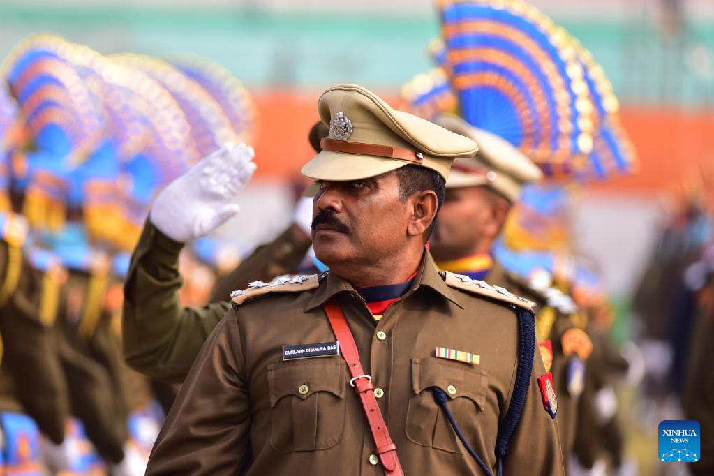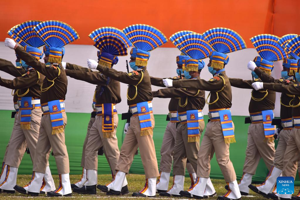 Indian paramilitary troopers take part in a parade during India's Republic Day celebrations in Nagaon district of India's northeastern state of Assam, Jan. 26, 2022. (Str/Xinhua)