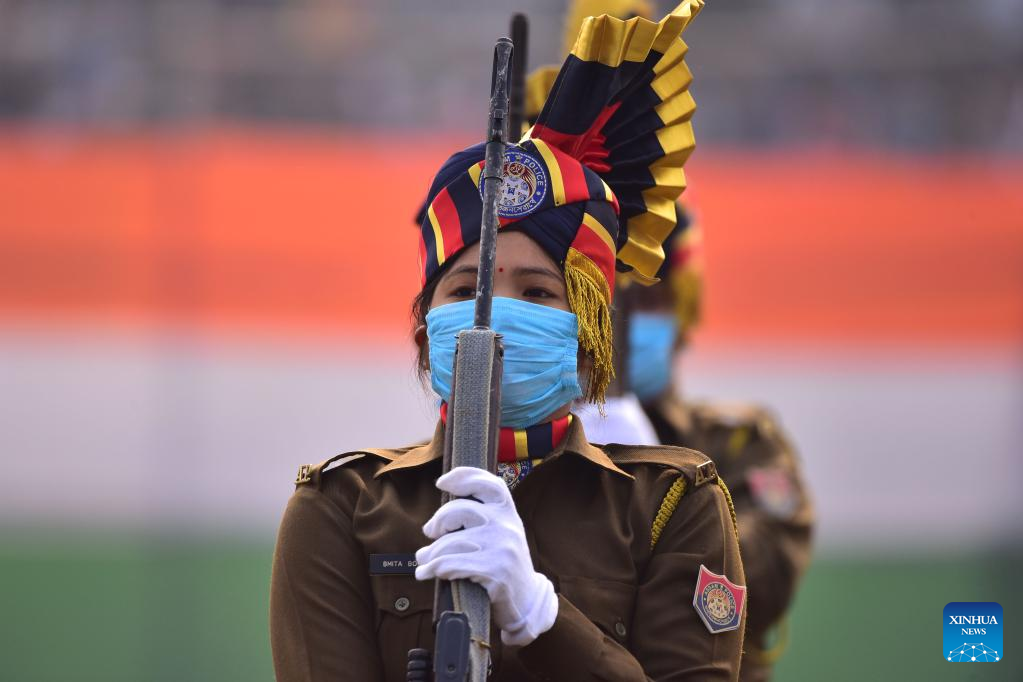 Indian women paramilitary troopers take part in a parade during India's Republic Day celebrations in Nagaon district of India's northeastern state of Assam, Jan. 26, 2022. (Str/Xinhua)