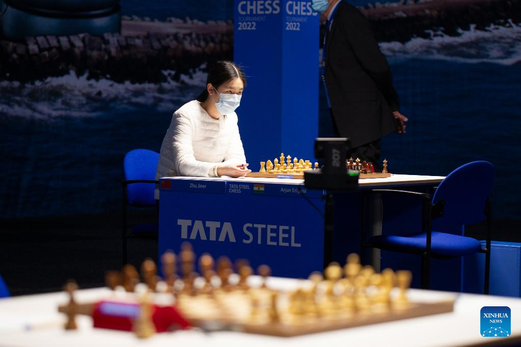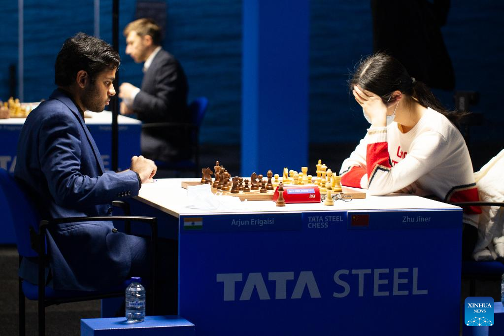 Arjun Erigaisi (L) of India competes against Zhu Jiner of China during the 9th round of the Tata Steel Chess Tournament 2022 in Wijk aan Zee, the Netherlands, Jan. 25, 2022. (Photo by Sylvia Lederer/Xinhua)