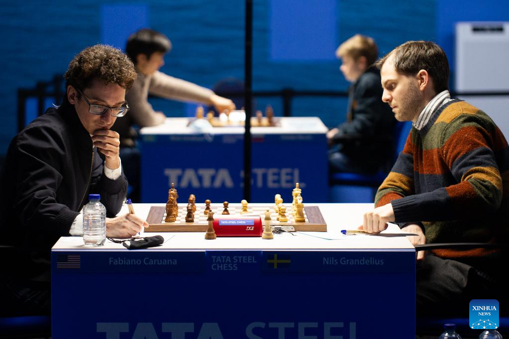 Fabiano Curuana (L) of the United States competes against Nils Grandelius of Sweden during the 9th round of the Tata Steel Chess Tournament 2022 in Wijk aan Zee, the Netherlands, Jan. 25, 2022. (Photo by Sylvia Lederer/Xinhua)