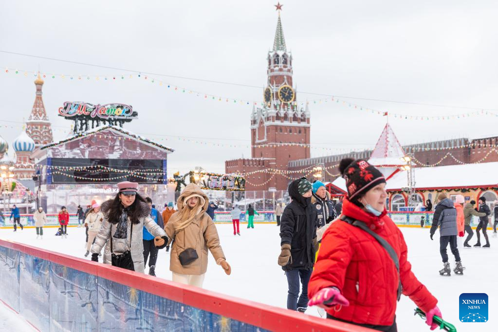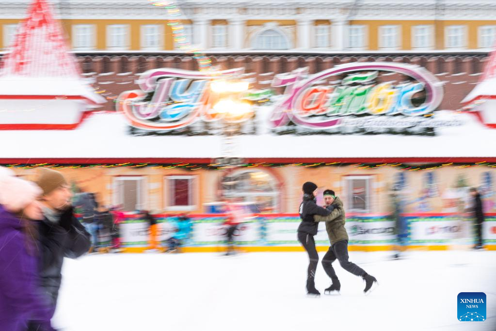 People skate on the GUM ice rink in Moscow, Russia, on Jan. 26, 2022. (Xinhua/Bai Xueqi)