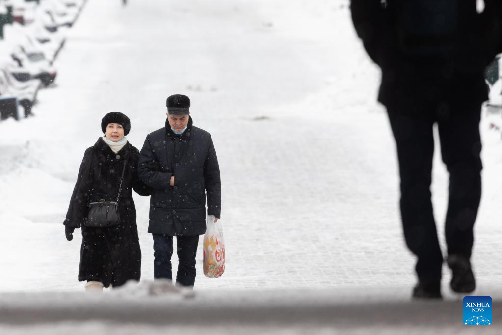 A couple walks near the Red Square in Moscow, Russia, on Jan. 26, 2022. (Xinhua/Bai Xueqi)