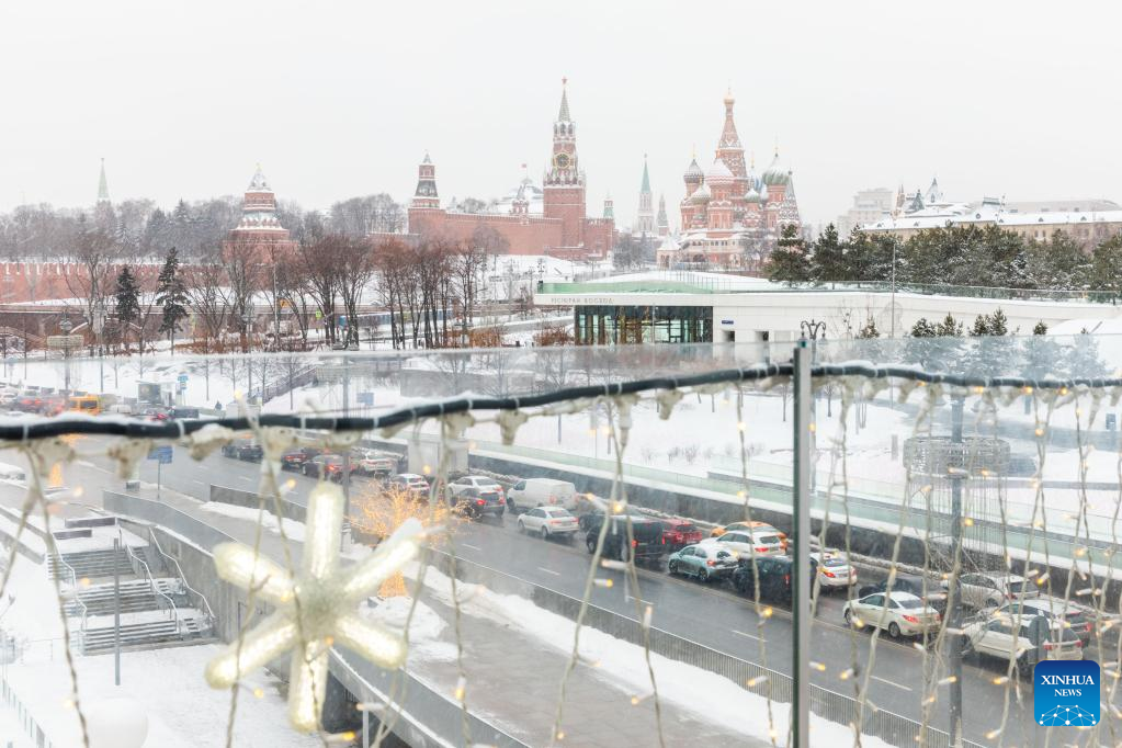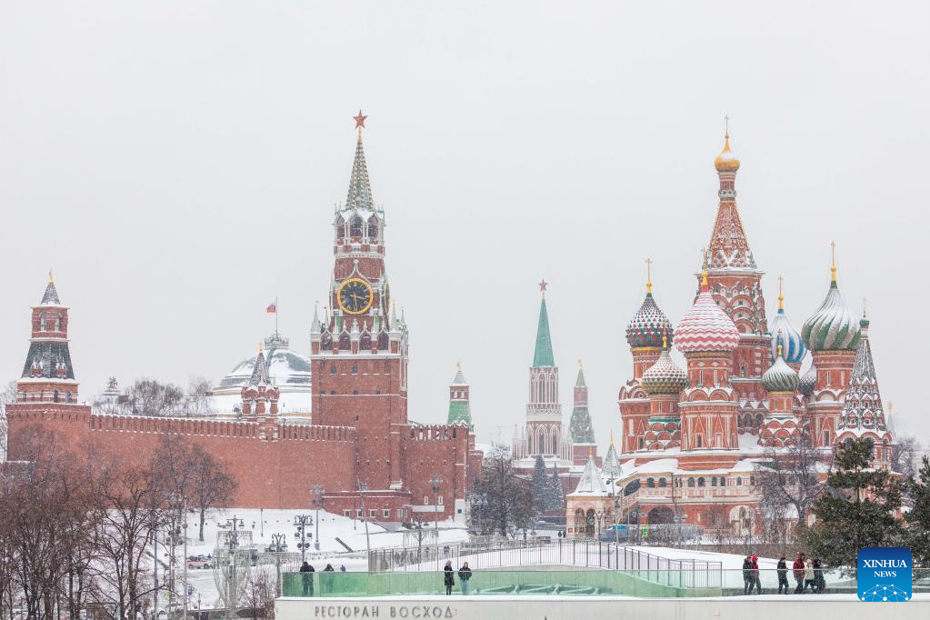 Photo taken on Jan. 26, 2022 shows the snow-covered Kremlin and Saint Basil's Cathedral in Moscow, Russia. (Xinhua/Bai Xueqi)