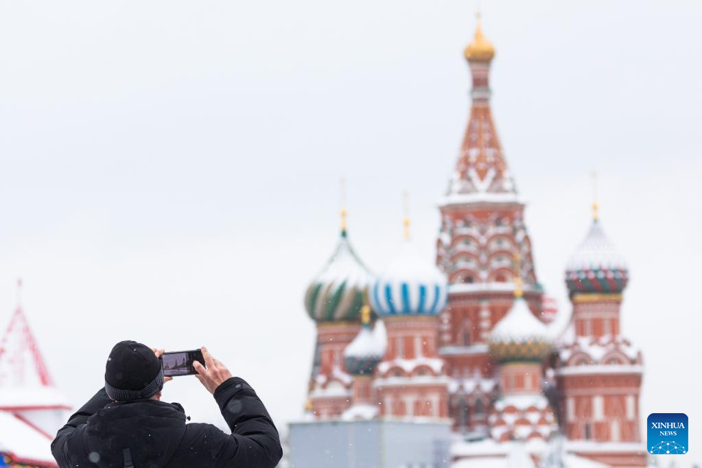 A man takes a photo in the Red Square in Moscow, Russia, on Jan. 26, 2022. (Xinhua/Bai Xueqi)