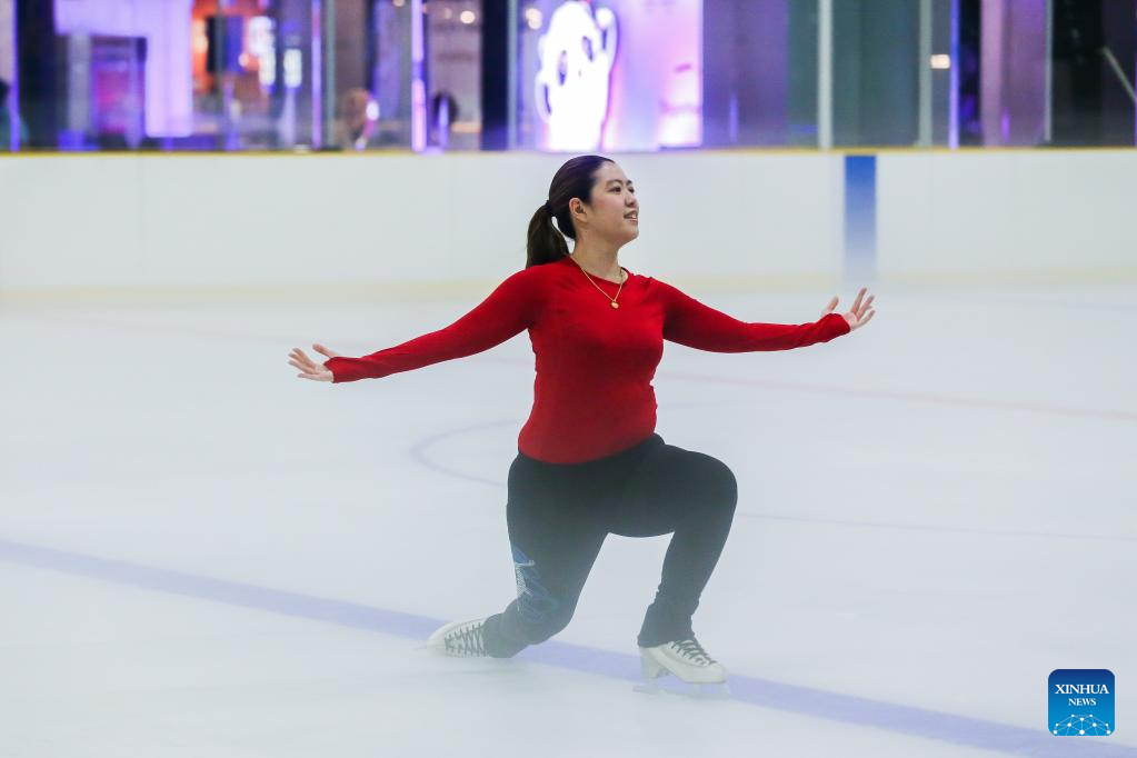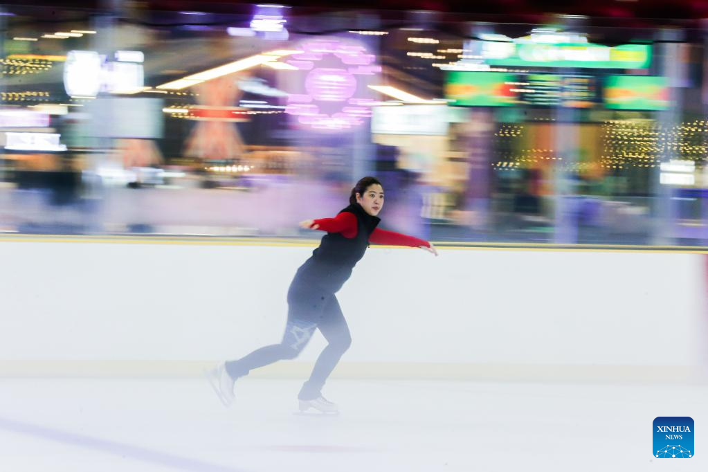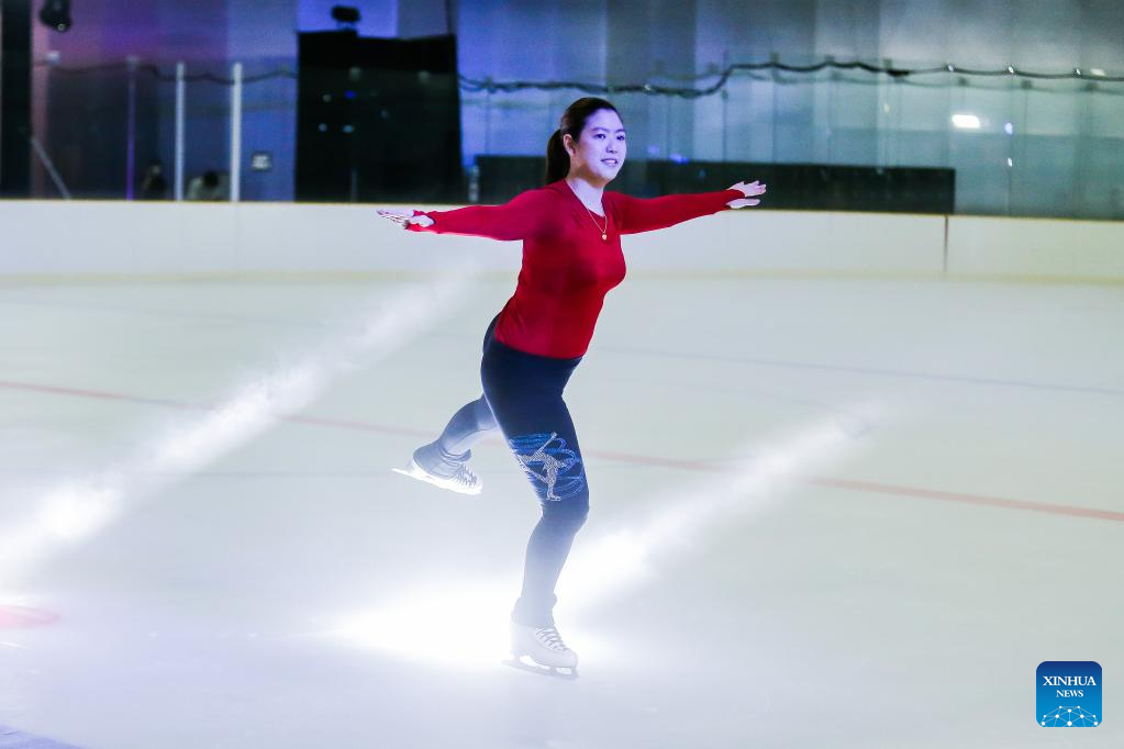 Nikki Cheng, 29, president of the Philippine Skating Union and a member of the Philippine delegation to the Beijing Winter Olympics, skates on the skating rink at a mall in Pasay City, the Philippines on January 21, 2022. (Xinhua/Rouelle Umali)