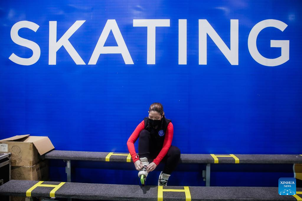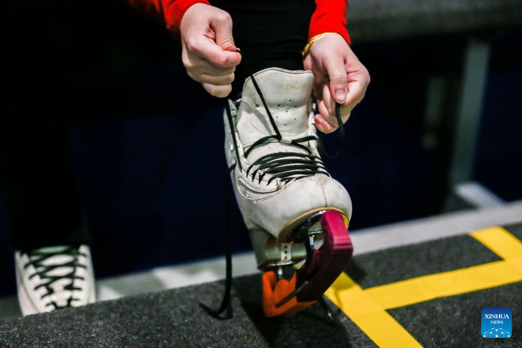 Nikki Cheng, 29, president of the Philippine Skating Union and a member of the Philippine delegation to the Beijing Winter Olympics, put on her figure skates at a mall in Pasay City, the Philippines on January 21, 2022. (Xinhua/Rouelle Umali)