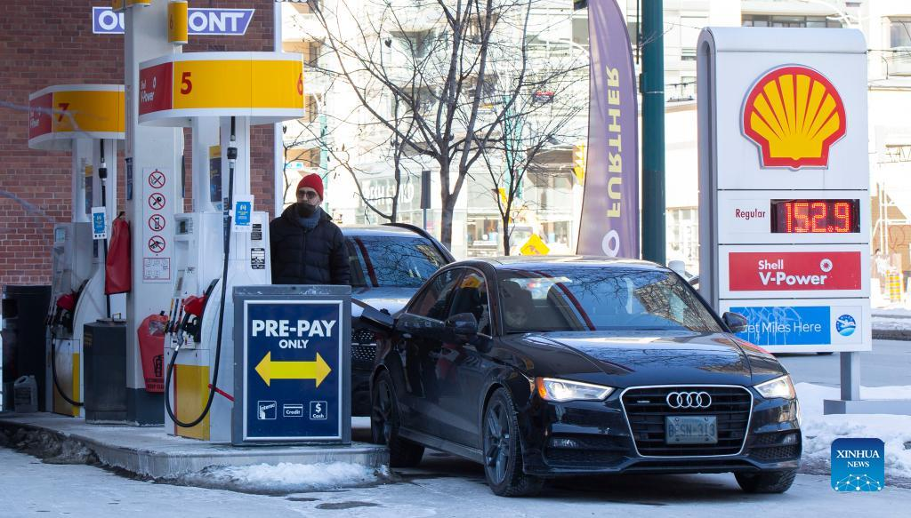 A man prepares to fuel a vehicle at a gas station in Toronto, Canada, on Jan. 29, 2022. The regular gas price in Toronto hit a record high to 1.529 Canadian dollars per liter on Saturday, according to local media. (Photo by Zou Zheng/Xinhua)