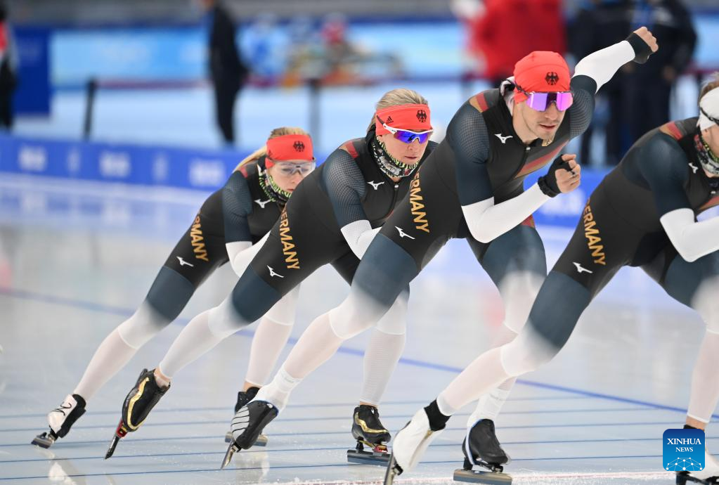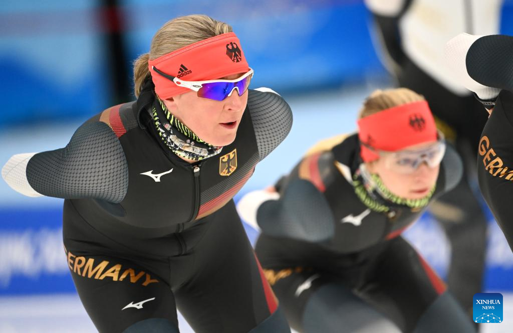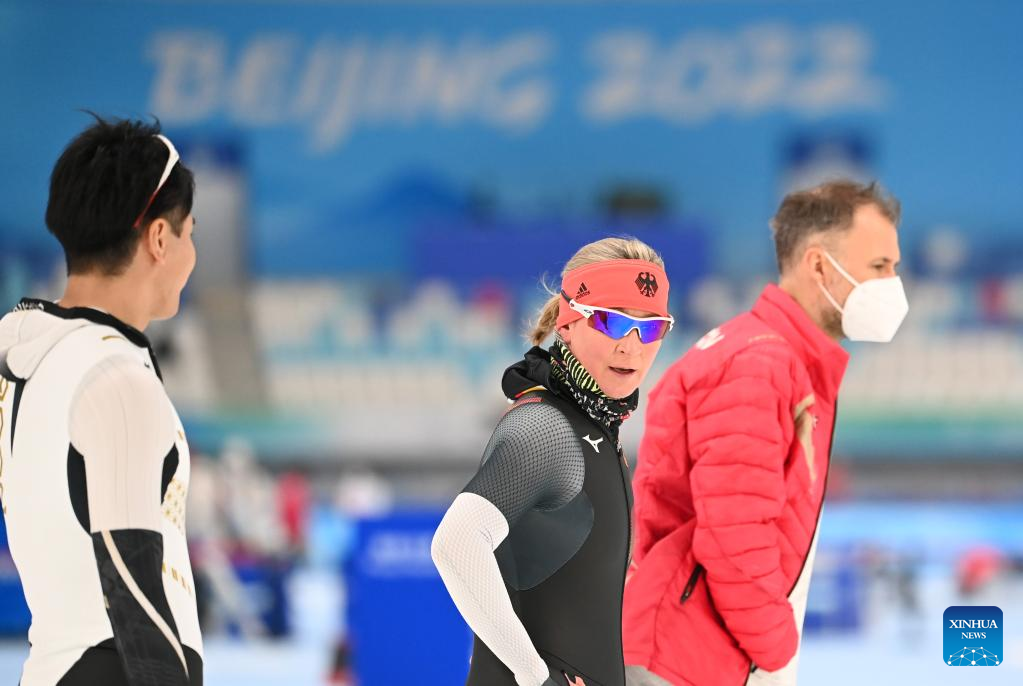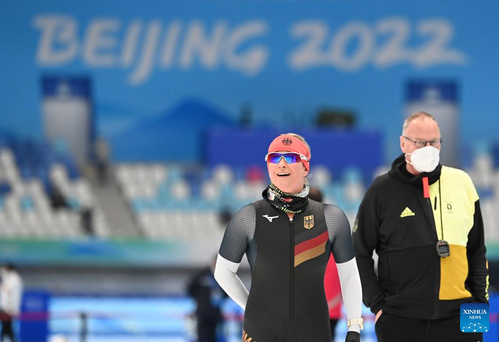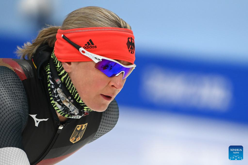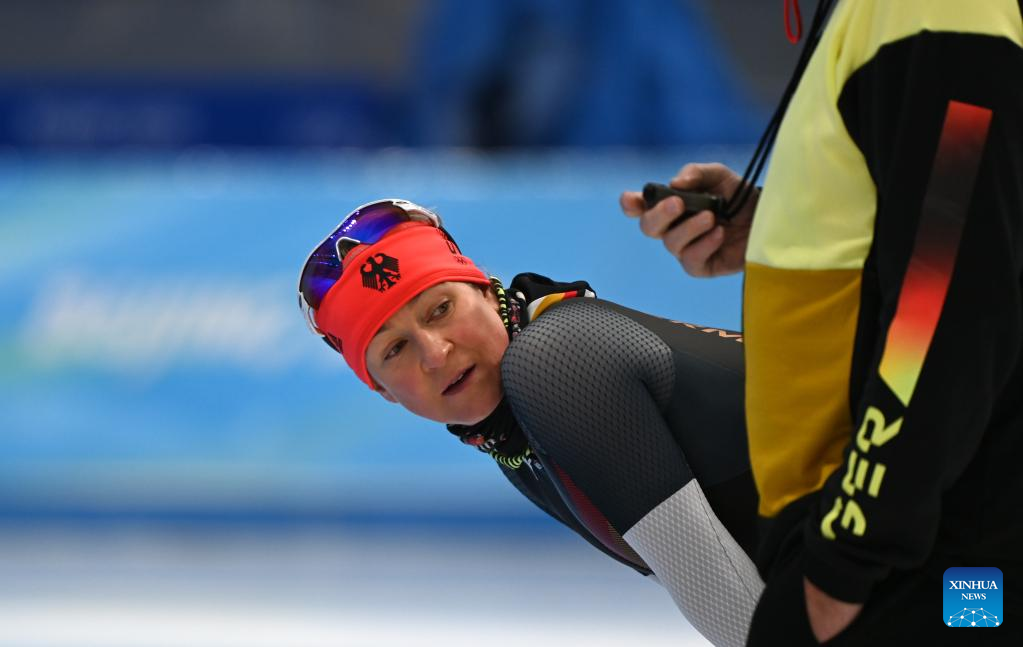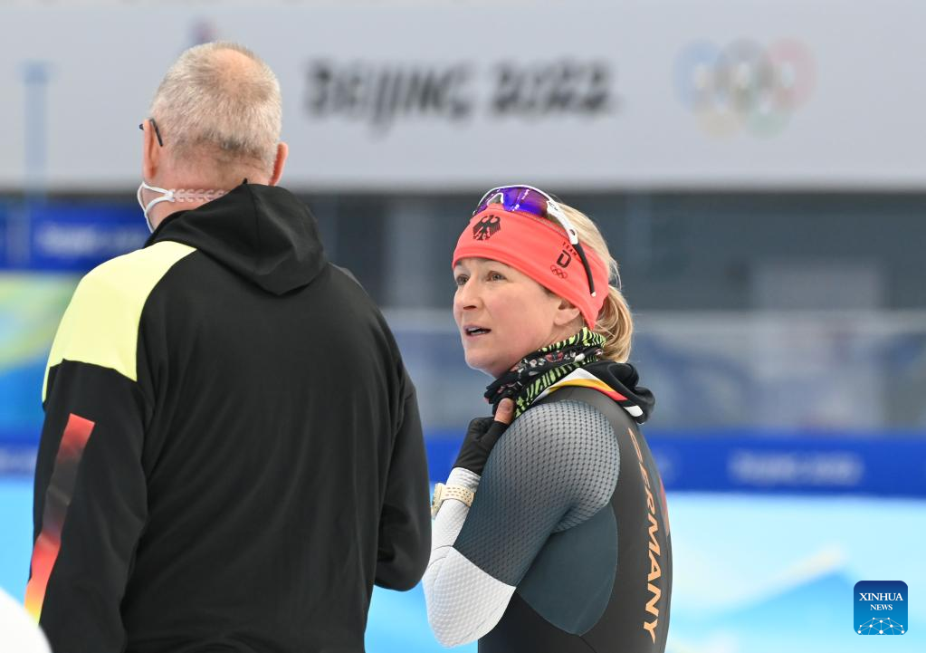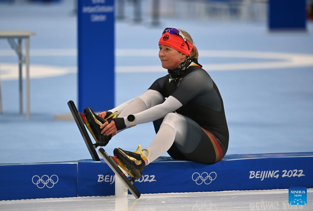 Claudia Pechstein (C) of Germany takes part in a training session at the National Speed Skating Oval in Beijing, capital of China, Jan. 31, 2022. Born on Feb. 22, 1972, the 49-year-old German speed skater will become the first woman to compete in eight Olympic Games and the oldest woman to compete during the 2022 Winter Olympics. (Xinhua/Wu Wei)