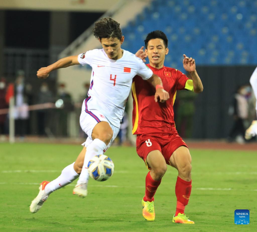 Wang Shenchao (L) of China vies with Do Hung Dung of Vietnam during the Group B match between China and Vietnam of FIFA World Cup Qatar 2022 Qualifier in Hanoi, Vietnam, on Feb. 1, 2022. China lost 1-3. (VNA/Handout via Xinhua)