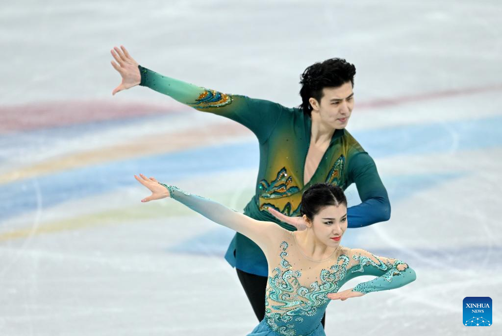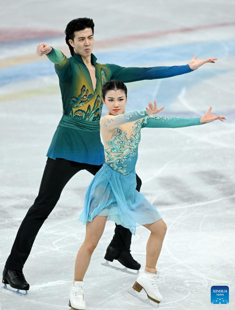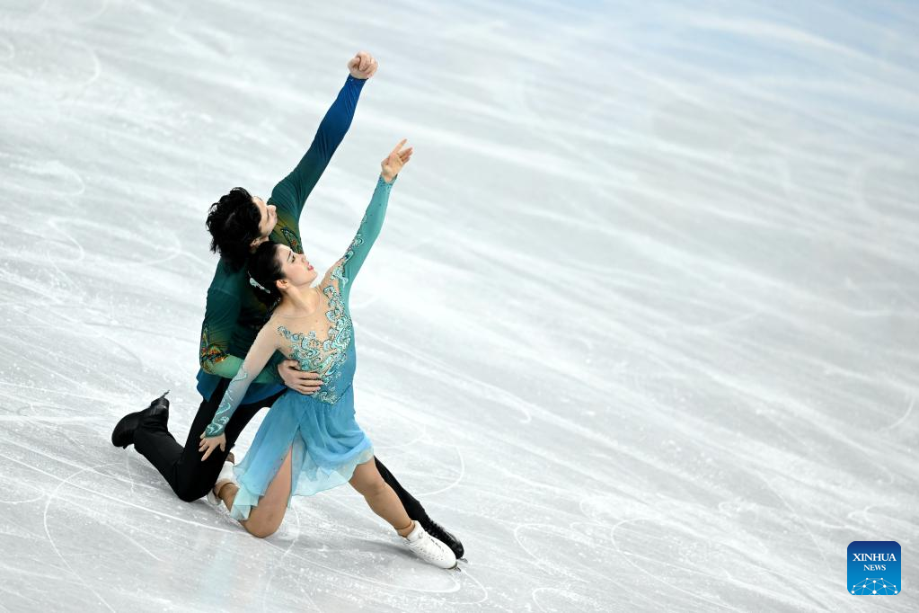 Wang Shiyue (R) and Liu Xinyu of China perform during the figure skating team event ice dance free dance at Capital Indoor Stadium in Beijing, capital of China, Feb. 7, 2022. (Xinhua/Li Yibo)