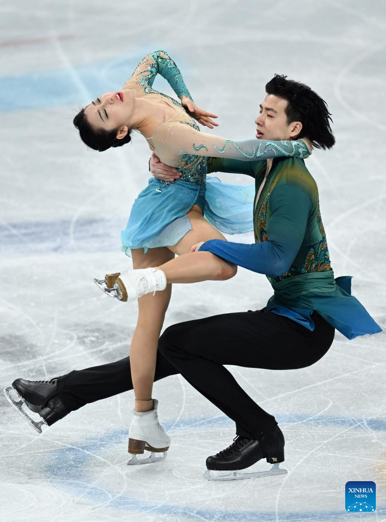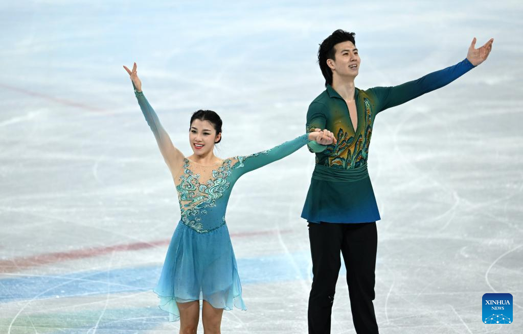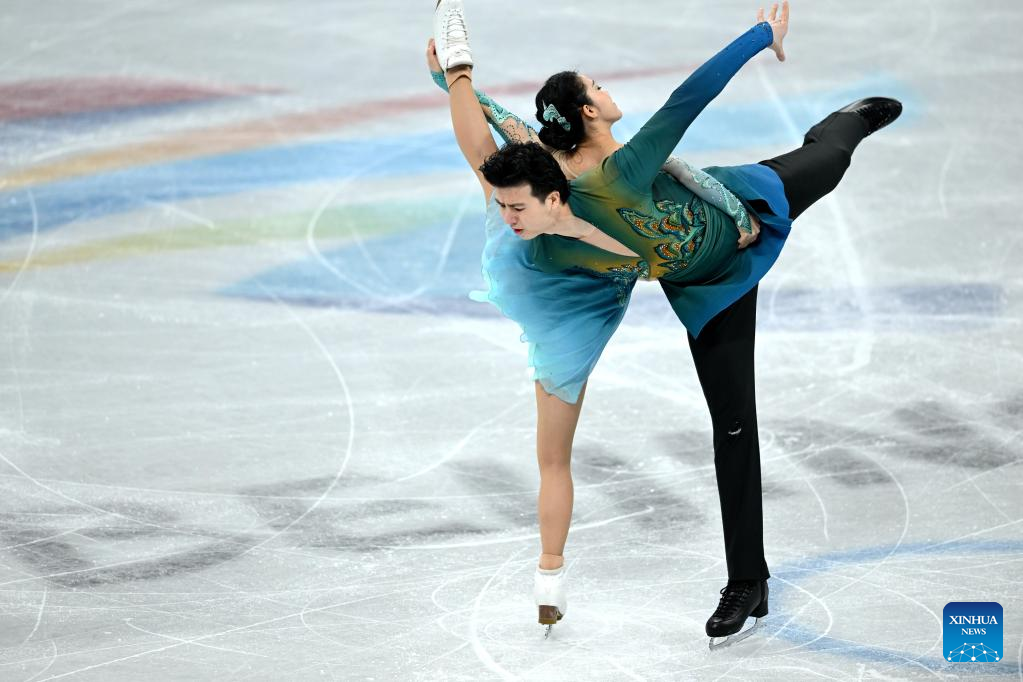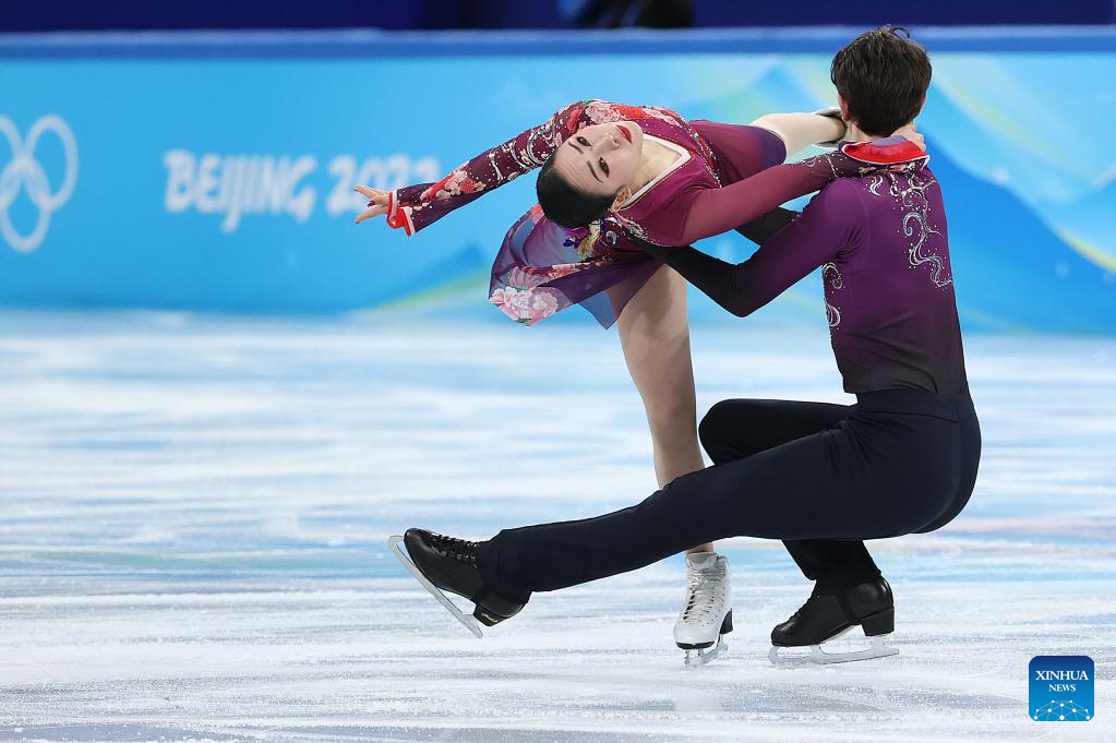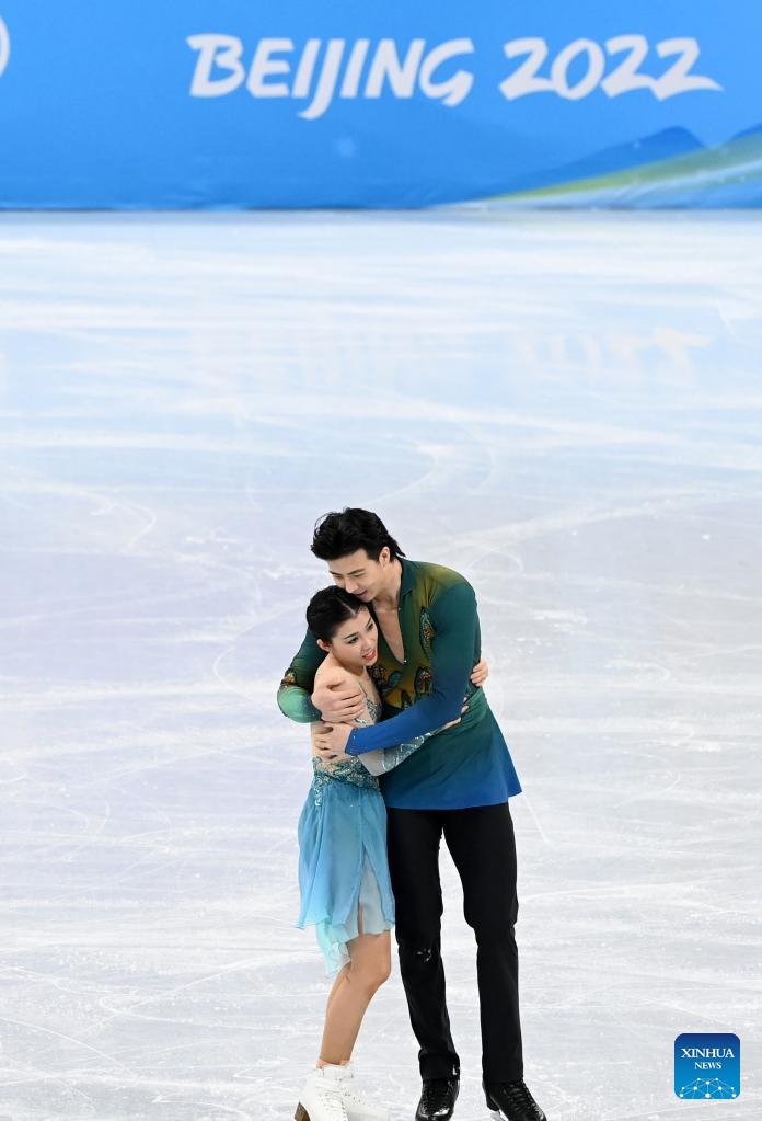 Wang Shiyue (back) and Liu Xinyu of China perform during the figure skating team event ice dance free dance at Capital Indoor Stadium in Beijing, capital of China, Feb. 7, 2022. (Xinhua/Li Yibo)