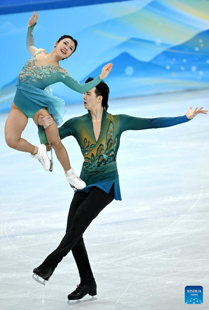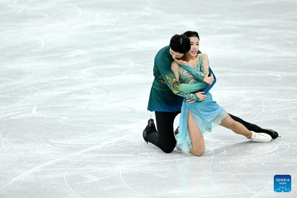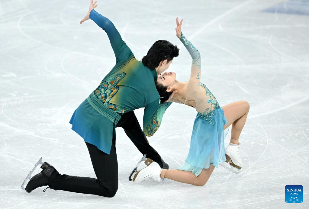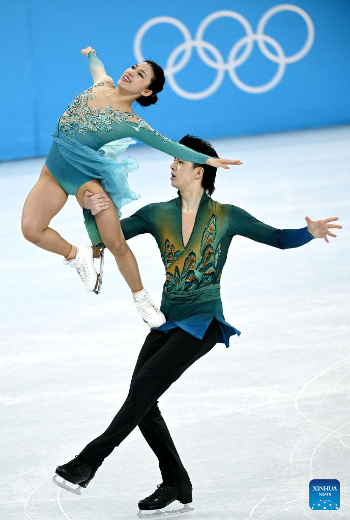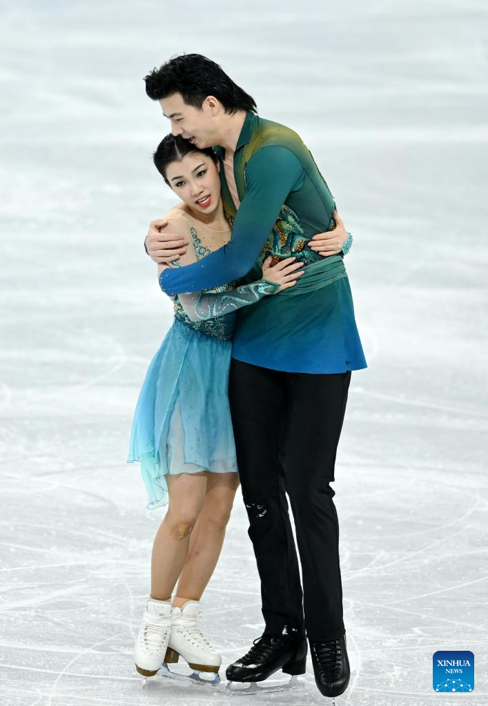 Wang Shiyue (back) and Liu Xinyu of China perform during the figure skating team event ice dance free dance at Capital Indoor Stadium in Beijing, capital of China, Feb. 7, 2022. (Xinhua/Li Yibo)