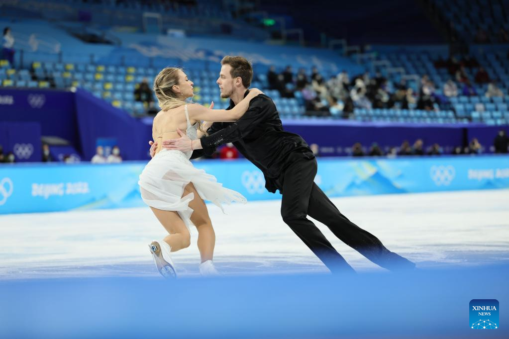 Victoria Sinitsina (L) and Nikita Katsalapov of ROC perform during the figure skating team event ice dance free dance at Capital Indoor Stadium in Beijing, capital of China, Feb. 7, 2022. (Xinhua/Lan Hongguang)