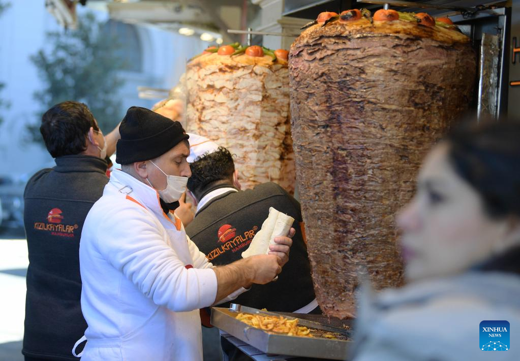 Photo taken on Feb. 11, 2022 shows people selling Turkish kebab at Taksim Square in Istanbul, Turkey. Turkey announced on Saturday new economic measures to ease the burden of Turkish citizens against the skyrocketing cost of living amid high inflation. Turkish President Recep Tayyip Erdogan said at an economic meeting in Istanbul via videoconference that in line with the new decisions, the 8 percent value-added tax (VAT) on basic food products was reduced to 1 percent. (Xinhua/Shadati)
