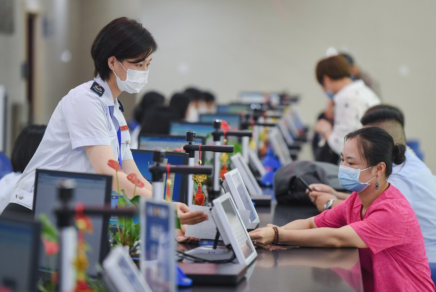 A staff member receives a credit repair application filed by an enterprise representative at a tax bureau service center in Taijiang District, Fuzhou, southeast China's Fujian Province, July 21, 2020. (Xinhua/Song Weiwei)