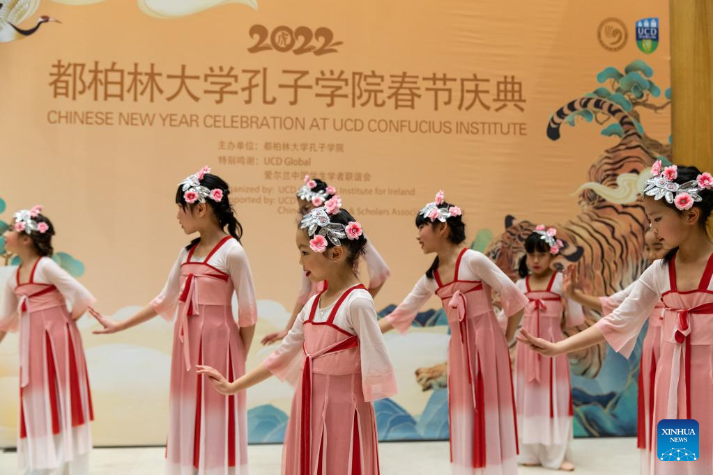 Children perform at an event celebrating the Chinese New Year held at the Confucius Institute of University College Dublin in Dublin, Ireland, Feb. 15, 2022. At the event, visitors enjoyed the traditional Chinese music and dance performances held inside the teaching building of Confucius Institute, as well as a lantern and fire flame show outside the building. (Photo by Liu Yanyan/Xinhua)