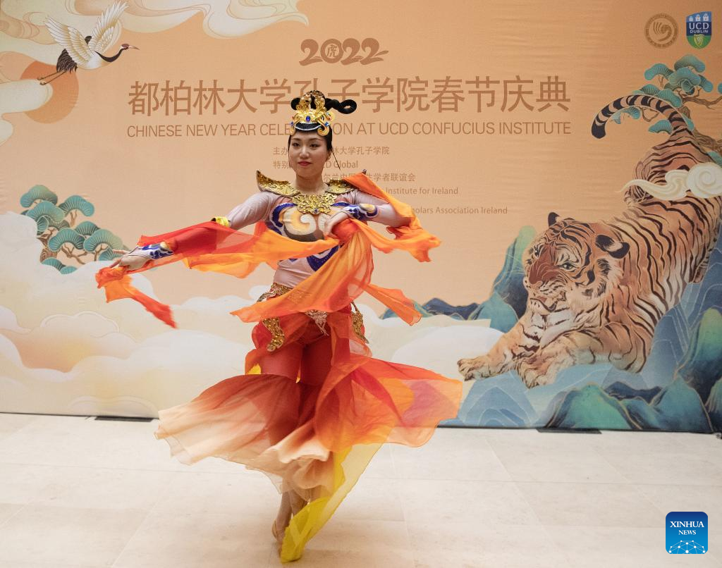 A performer dances at an event celebrating the Chinese New Year held at the Confucius Institute of University College Dublin in Dublin, Ireland, Feb. 15, 2022. At the event, visitors enjoyed the traditional Chinese music and dance performances held inside the teaching building of Confucius Institute, as well as a lantern and fire flame show outside the building. (Photo by Liu Yanyan/Xinhua)