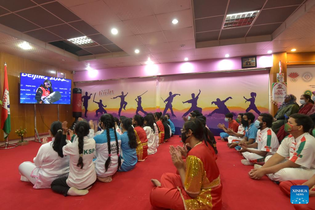 Wushu students applause as they watch the Beijing 2022 Winter Olympics at the Bangladesh Wushu Federation in Dhaka, Bangladesh, Feb. 10, 2022. The Beijing Winter Olympics has ignited enthusiasm from Bangladesh Wushu students, despite winter sports being rare in the tropical country in South Asia.(Xinhua)