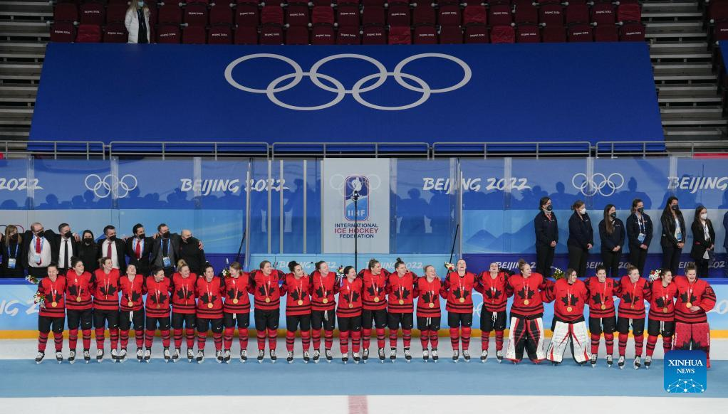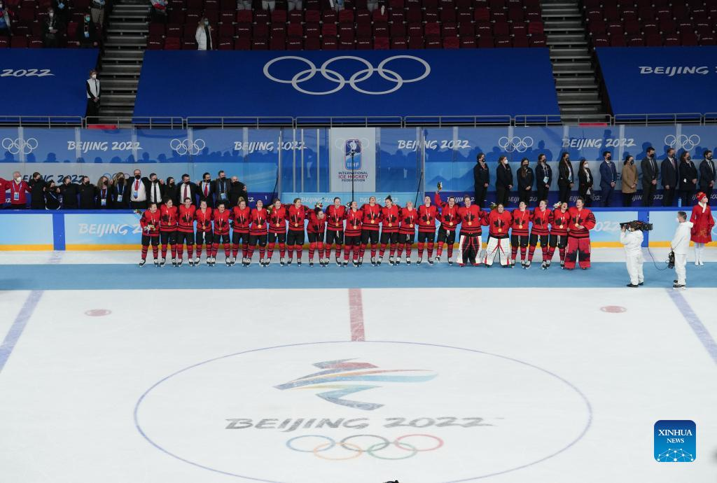 Team Canada attend the awarding ceremony for the women's ice hockey of Beijing 2022 Winter Olympics at Wukesong Sports Centre in Beijing, capital of China, Feb. 17, 2022. (Xinhua/Meng Yongmin)