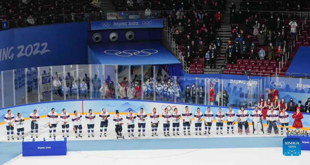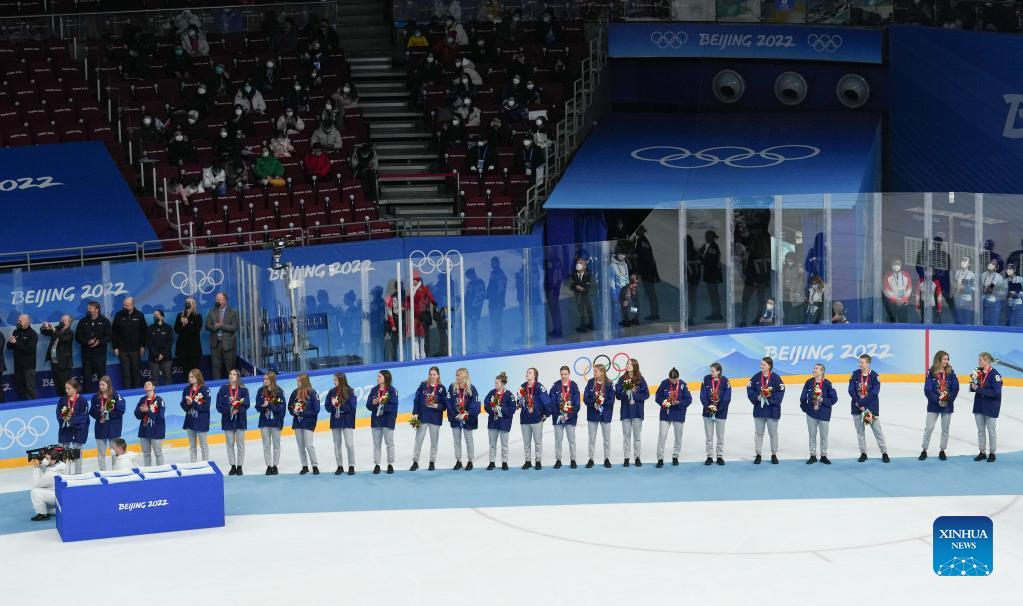 Team USA attend the awarding ceremony for the women's ice hockey of Beijing 2022 Winter Olympics at Wukesong Sports Centre in Beijing, capital of China, Feb. 17, 2022. (Xinhua/Meng Yongmin)