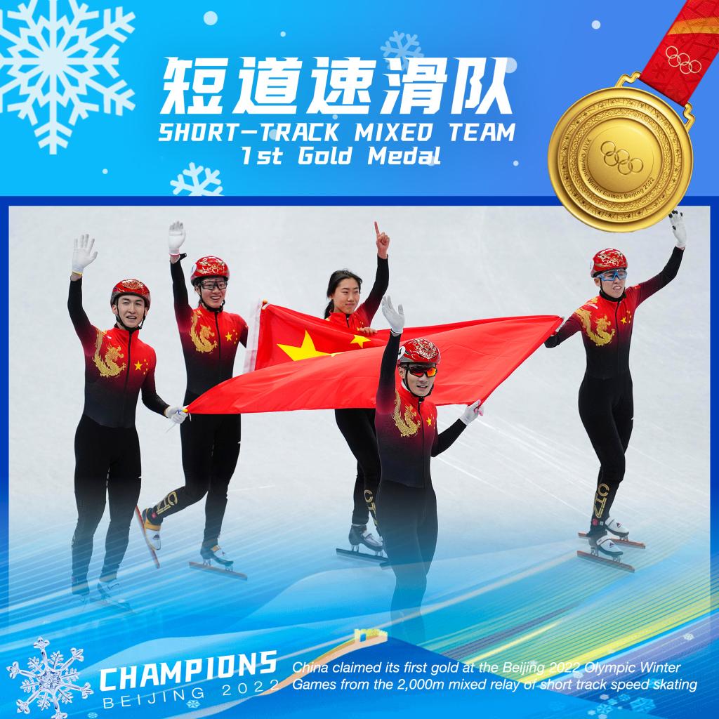 ↑China claimed its first gold at the Beijing 2022 Olympic Winter Games in the 2,000m mixed team relay of short track speed skating on Feb. 5. (Xinhua/Xiong Qi)