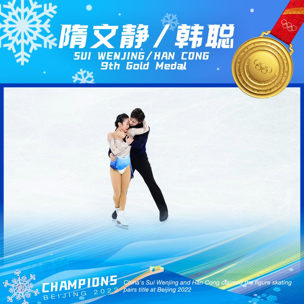 ↑ China's two-time world champions Sui Wenjing and Han Cong claimed the figure skating pairs title at Beijing 2022.