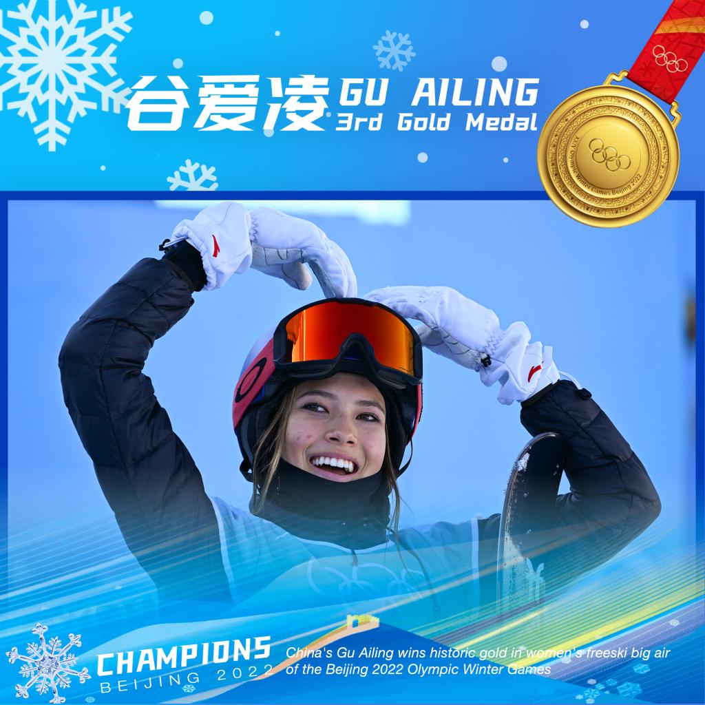 ↑Chinese athlete Gu Ailing claimed the historic gold in the women's freeski big air of the Beijing 2022 Olympic Winter Games at Big Air Shougang on Feb. 8. (Xinhua/Xue Yuge)