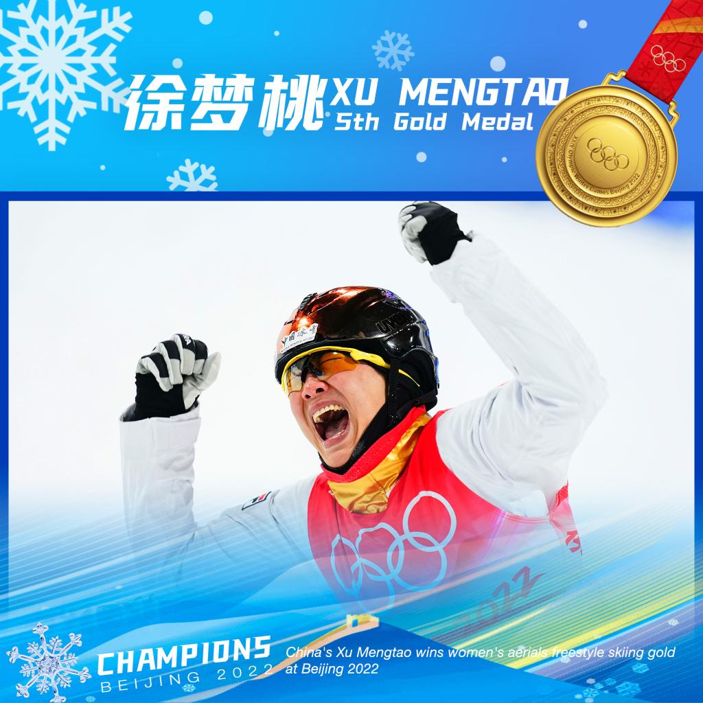 ↑China's Xu Mengtao won women's aerials freestyle skiing gold at Beijing 2022 on Feb. 14. (Xinhua/Xu Chang)