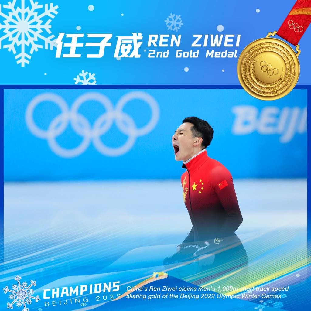 ↑China's Ren Ziwei clinched his first individual gold medal in the men's 1,000-meter short track speed skating in one minute, 26.768 seconds at Beijing 2022 on Feb. 7. (Xinhua/Lan Hongguang)
