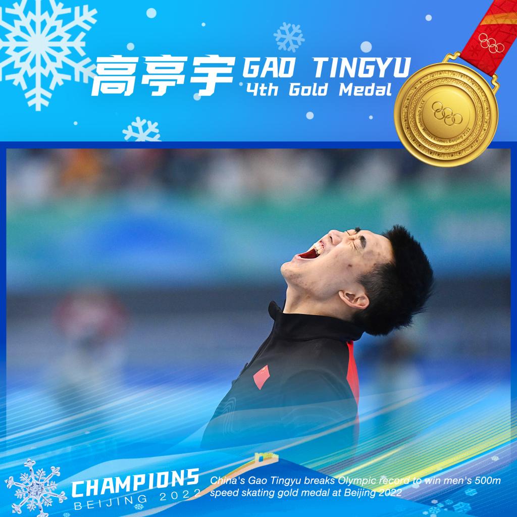 ↑China's Gao Tingyu won the men's 500m speed skating gold in a new Olympic record time at the Beijing Winter Olympics here on Feb. 12. (Xinhua/Xiong Qi)