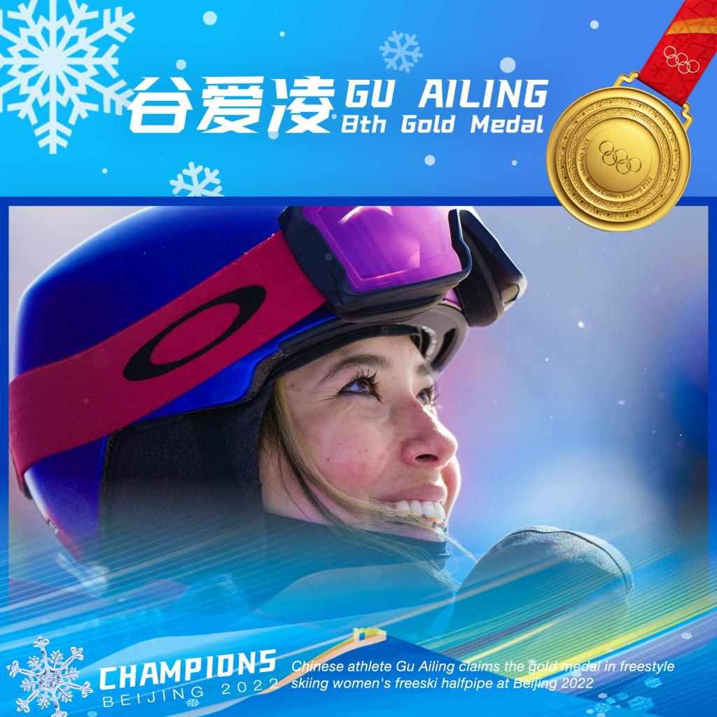 ↑Chinese athlete Gu Ailing claimed the gold medal in freestyle skiing women's freeski halfpipe at Beijing 2022 on Feb. 18. (Xinhua/Xue Yubin)