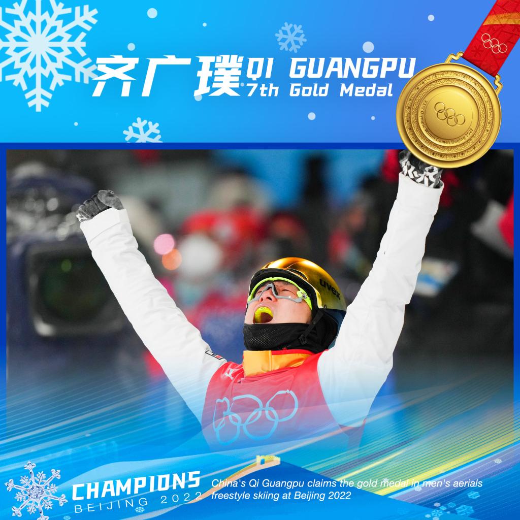 ↑China's Qi Guangpu claimed the gold medal in men's aerials freestyle skiing at the Beijing Winter Olympics on Feb. 16. (Xinhua/Xue Yubin)