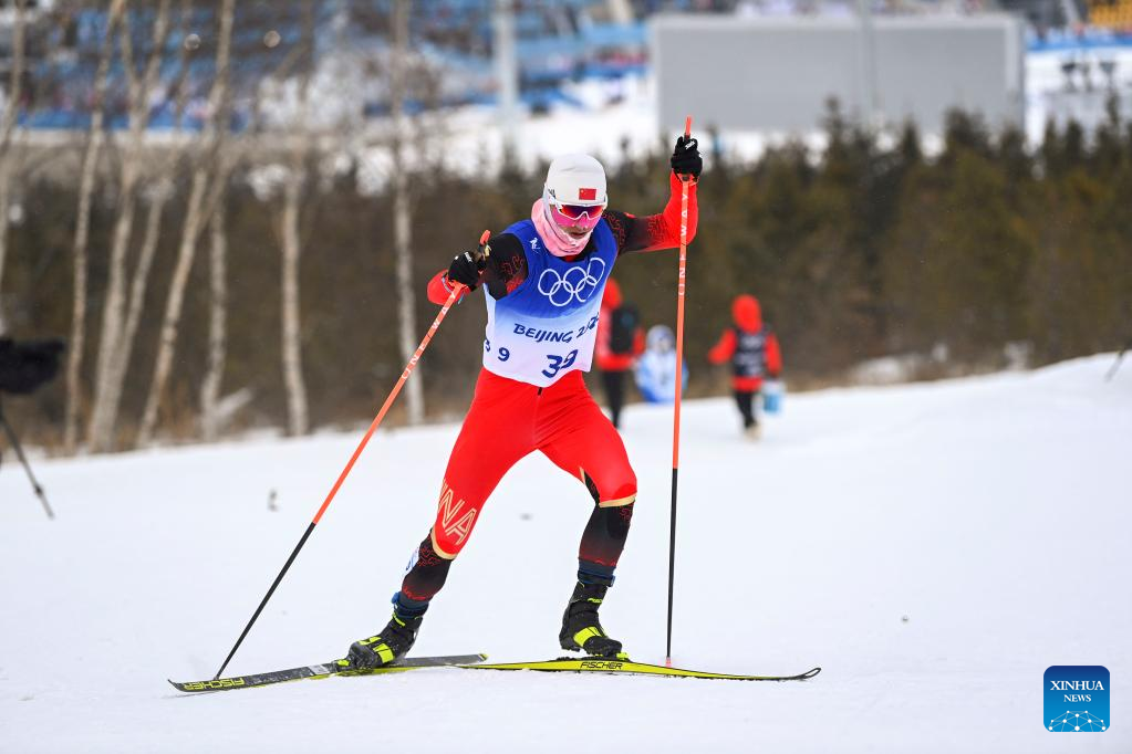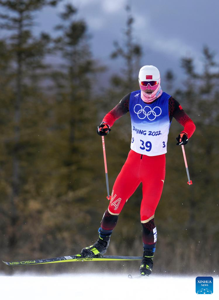 Liu Rongsheng of China competes during the cross-country skiing men's 50km mass start free of Beijing 2022 Winter Olympics at National Cross-Country Skiing Centre in Zhangjiakou, north China's Hebei Province, Feb. 19, 2022. The men's 50km cross-country mass start race on Saturday has been delayed by an hour to 1500 local time (0700 GMT) and shortened to 30km due to high winds at the National Cross-Country Skiing Centre. (Xinhua/Hu Huhu)