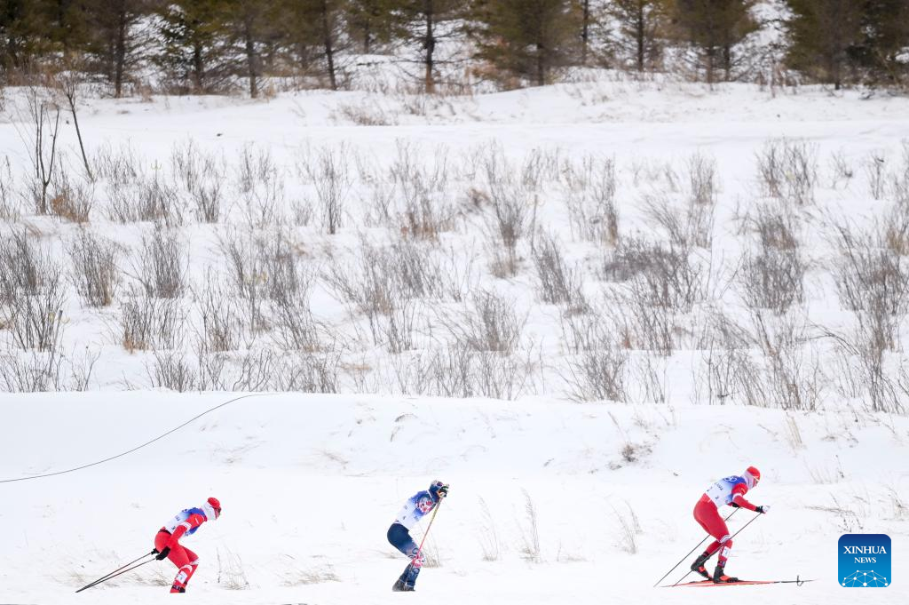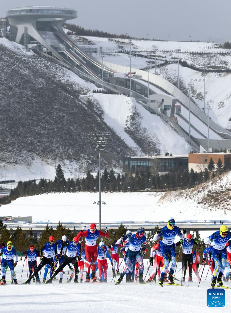 Athletes compete during the cross-country skiing men's 50km mass start free of Beijing 2022 Winter Olympics at National Cross-Country Skiing Centre in Zhangjiakou, north China's Hebei Province, Feb. 19, 2022. The men's 50km cross-country mass start race on Saturday has been delayed by an hour to 1500 local time (0700 GMT) and shortened to 30km due to high winds at the National Cross-Country Skiing Centre. (Xinhua/Deng Hua)