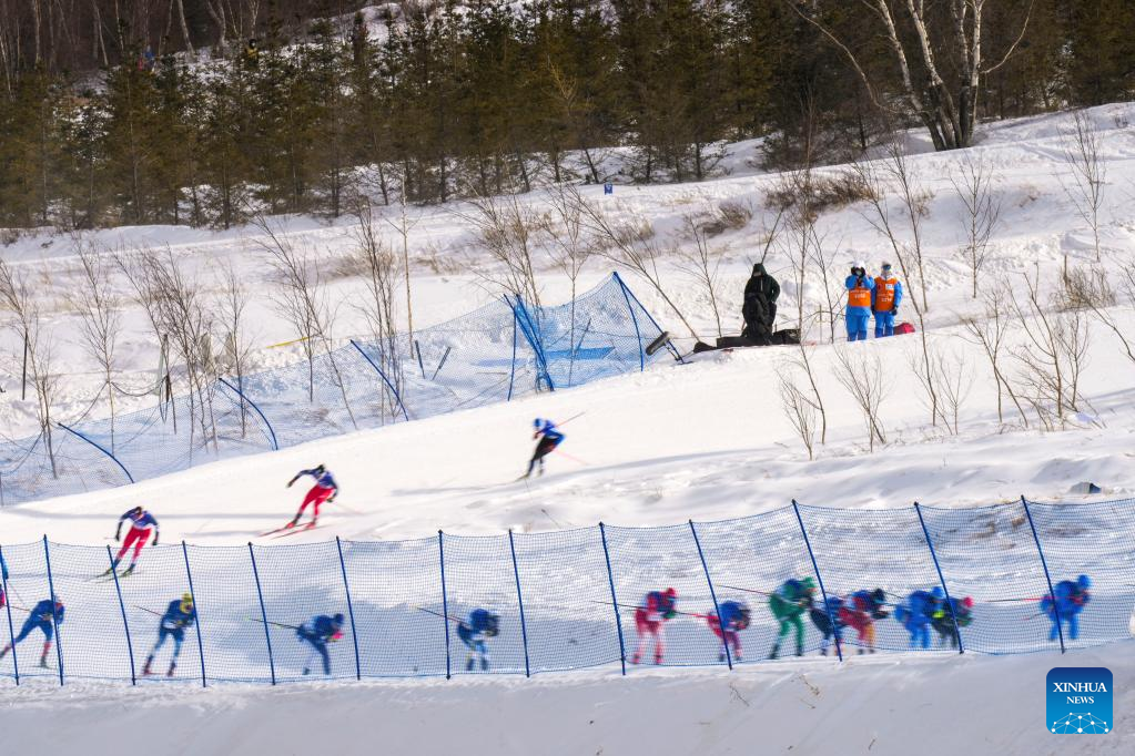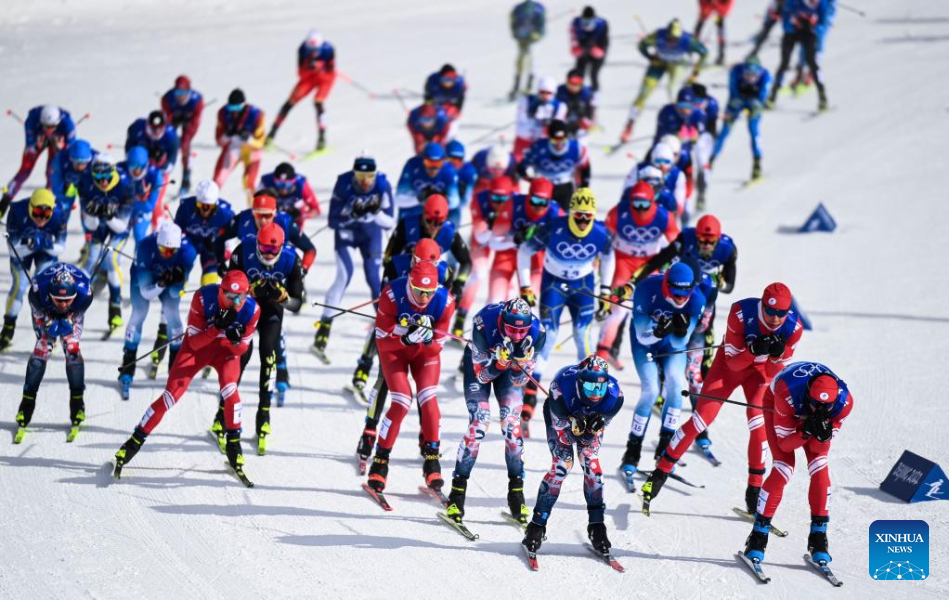 Athletes compete during the cross-country skiing men's 50km mass start free of Beijing 2022 Winter Olympics at National Cross-Country Skiing Centre in Zhangjiakou, north China's Hebei Province, Feb. 19, 2022. The men's 50km cross-country mass start race on Saturday has been delayed by an hour to 1500 local time (0700 GMT) and shortened to 30km due to high winds at the National Cross-Country Skiing Centre. (Xinhua/Liu Chan)