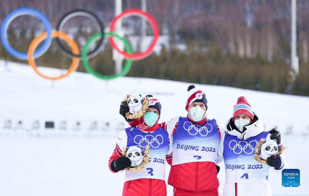 Alexander Bolshunov (C), Ivan Yakimushkin (L) of ROC and Simen Hegstad Krueger of Norway pose for photos after the cross-country skiing men's 50km mass start free of Beijing 2022 Winter Olympics at National Cross-Country Skiing Centre in Zhangjiakou, north China's Hebei Province, Feb. 19, 2022. The men's 50km cross-country mass start race on Saturday has been delayed by an hour to 1500 local time (0700 GMT) and shortened to 30km due to high winds at the National Cross-Country Centre. (Xinhua/Liu Chan)