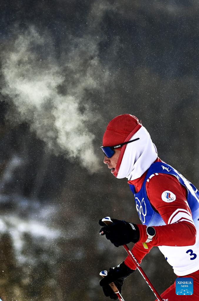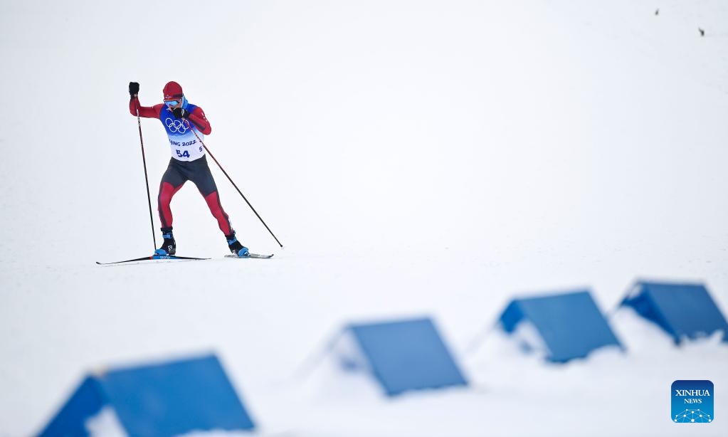 Ivan Yakimushkin of ROC competes during the cross-country skiing men's 50km mass start free of Beijing 2022 Winter Olympics at National Cross-Country Skiing Centre in Zhangjiakou, north China's Hebei Province, Feb. 19, 2022. The men's 50km cross-country mass start race on Saturday has been delayed by an hour to 1500 local time (0700 GMT) and shortened to 30km due to high winds at the National Cross-Country Skiing Centre. (Xinhua/Zhang Hongxiang)