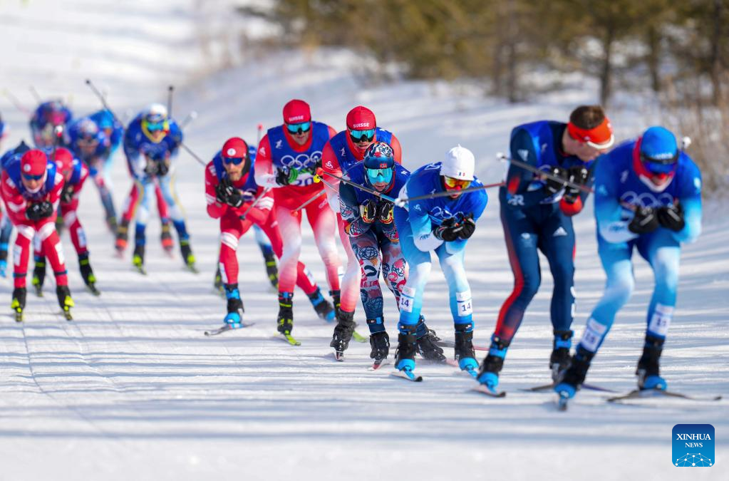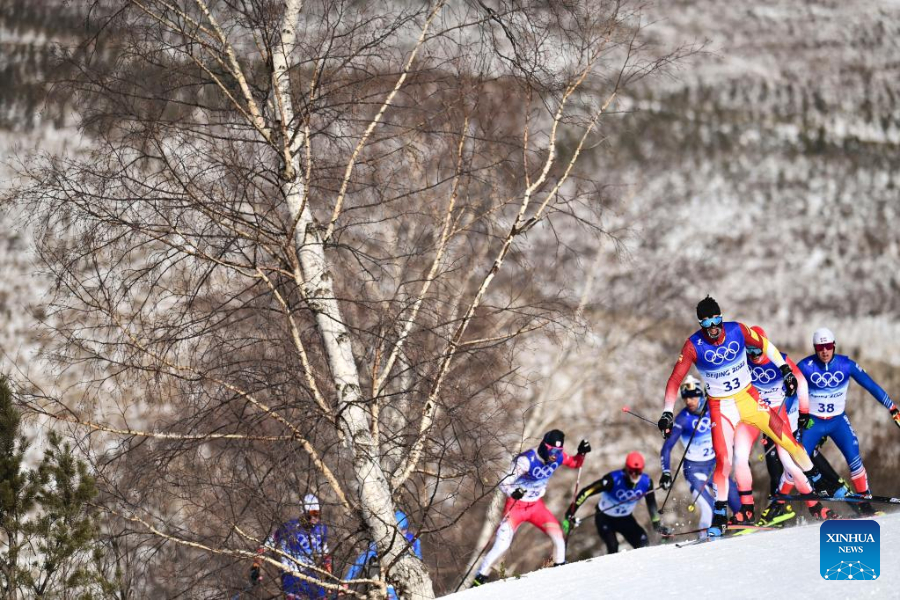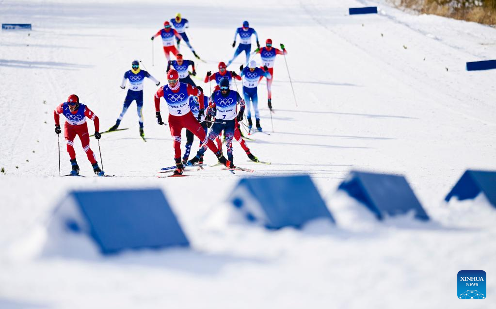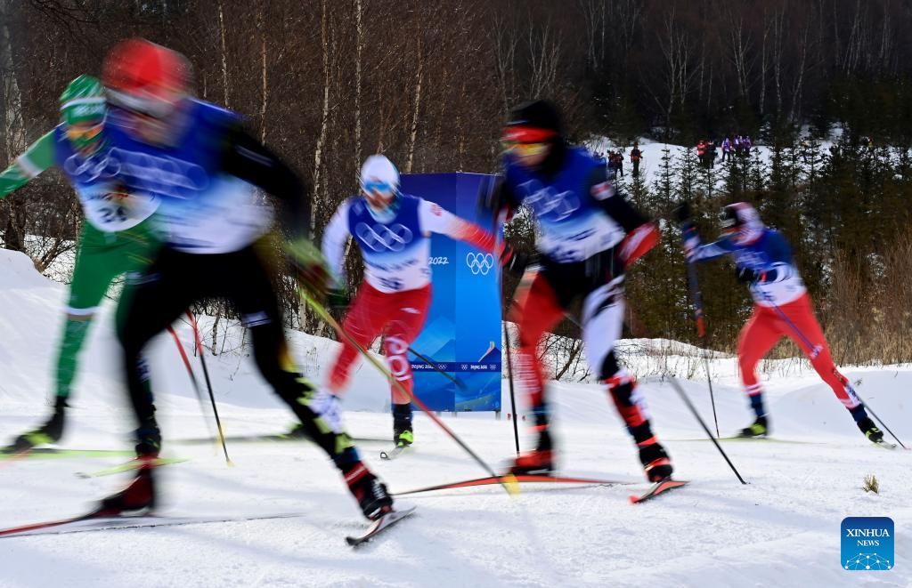 Athletes compete during the cross-country skiing men's 50km mass start free of Beijing 2022 Winter Olympics at National Cross-Country Skiing Centre in Zhangjiakou, north China's Hebei Province, Feb. 19, 2022. The men's 50km cross-country mass start race on Saturday has been delayed by an hour to 1500 local time (0700 GMT) and shortened to 30km due to high winds at the National Cross-Country Skiing Centre. (Xinhua/Hu Huhu)