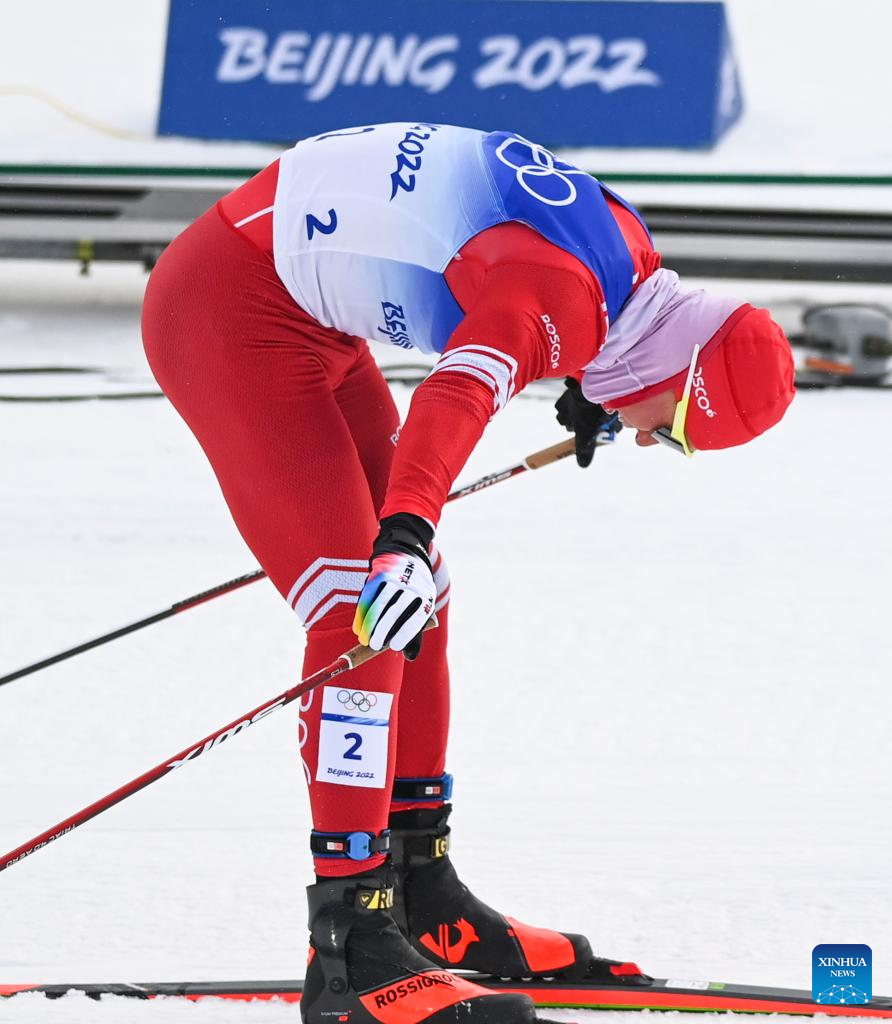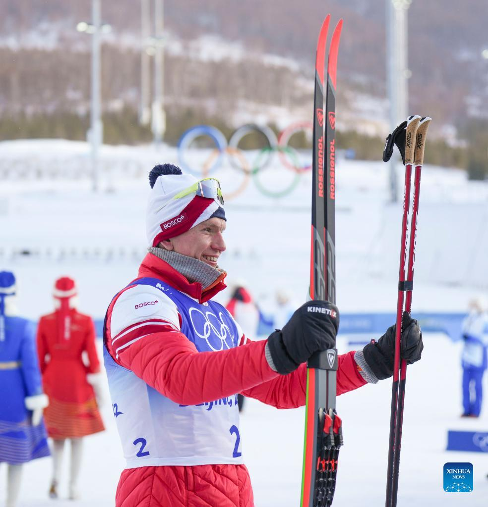 Alexander Bolshunov of ROC reacts after the cross-country skiing men's 50km mass start free of Beijing 2022 Winter Olympics at National Cross-Country Skiing Centre in Zhangjiakou, north China's Hebei Province, Feb. 19, 2022. The men's 50km cross-country mass start race on Saturday has been delayed by an hour to 1500 local time (0700 GMT) and shortened to 30km due to high winds at the National Cross-Country Centre. (Xinhua/Liu Chan)