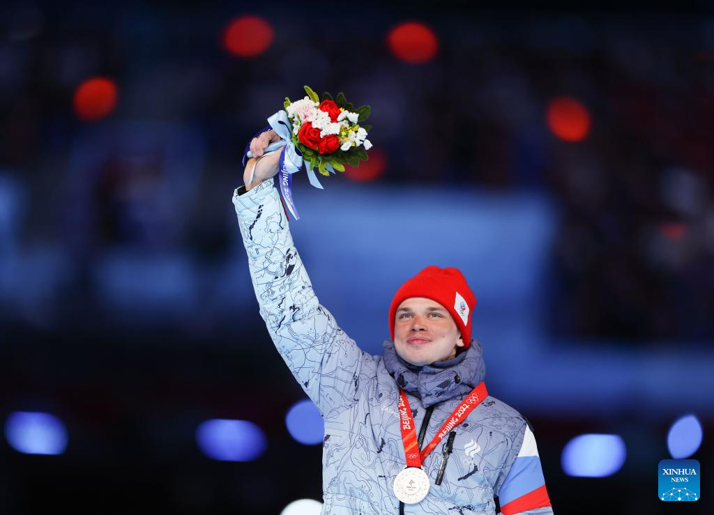 Silver medalist Ivan Yakimushkin of ROC reacts during the Victory Ceremony of cross-country skiing men's 50km mass start free event during the closing ceremony of the Beijing 2022 Olympic Winter Games at the National Stadium in Beijing, capital of China, Feb. 20, 2022. (Xinhua/Cao Can)