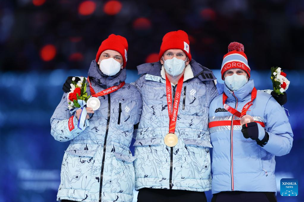 Gold medalist Alexander Bolshunov (C) of ROC, silver medalist Ivan Yakimushkin (L) of ROC and bronze medalist Simen Hegstad Krueger of Norway pose for photos during the Victory Ceremony of cross-country skiing men's 50km mass start free event during the closing ceremony of the Beijing 2022 Olympic Winter Games at the National Stadium in Beijing, capital of China, Feb. 20, 2022. (Xinhua/Cao Can)