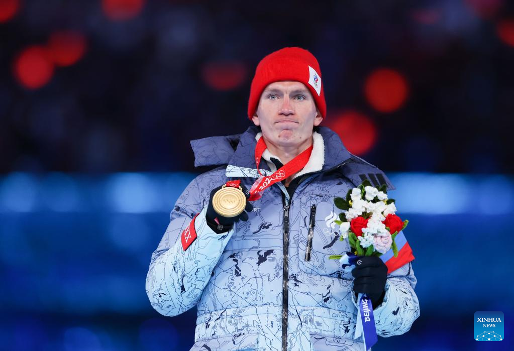 Gold medalist Alexander Bolshunov of ROC reacts during the Victory Ceremony of cross-country skiing men's 50km mass start free event during the closing ceremony of the Beijing 2022 Olympic Winter Games at the National Stadium in Beijing, capital of China, Feb. 20, 2022. (Xinhua/Cao Can)