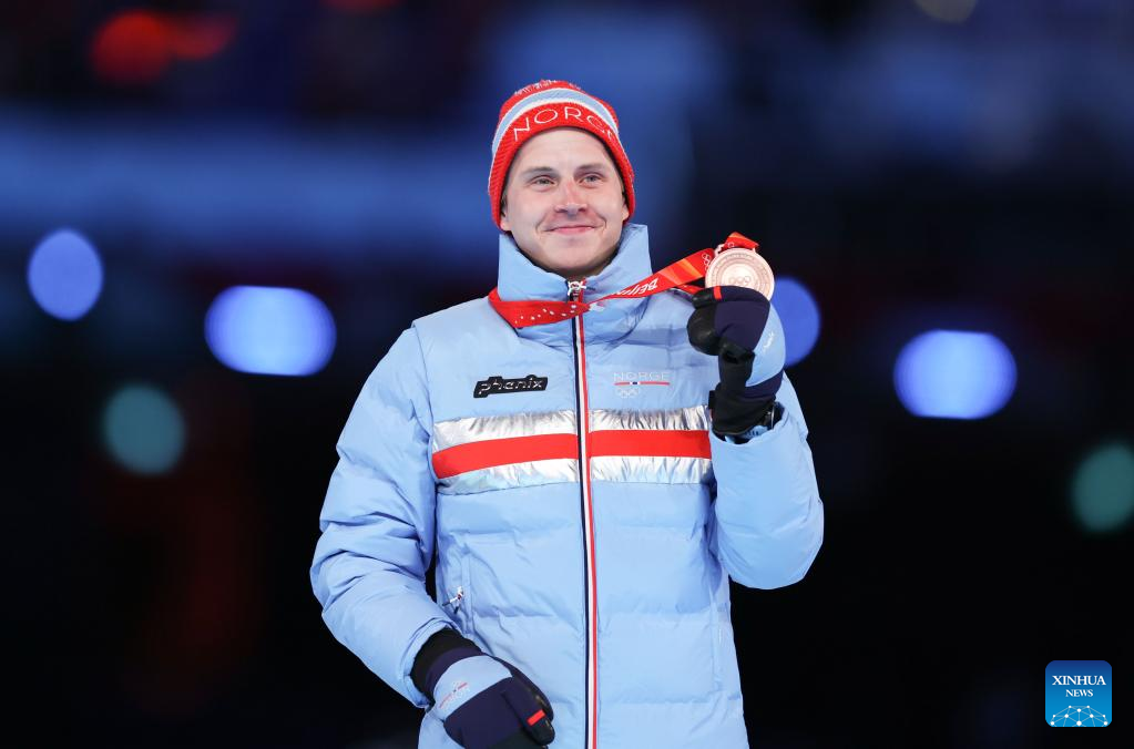 Bronze medalist Simen Hegstad Krueger of Norway reacts during the Victory Ceremony of cross-country skiing men's 50km mass start free event during the closing ceremony of the Beijing 2022 Olympic Winter Games at the National Stadium in Beijing, capital of China, Feb. 20, 2022. (Xinhua/Cao Can)