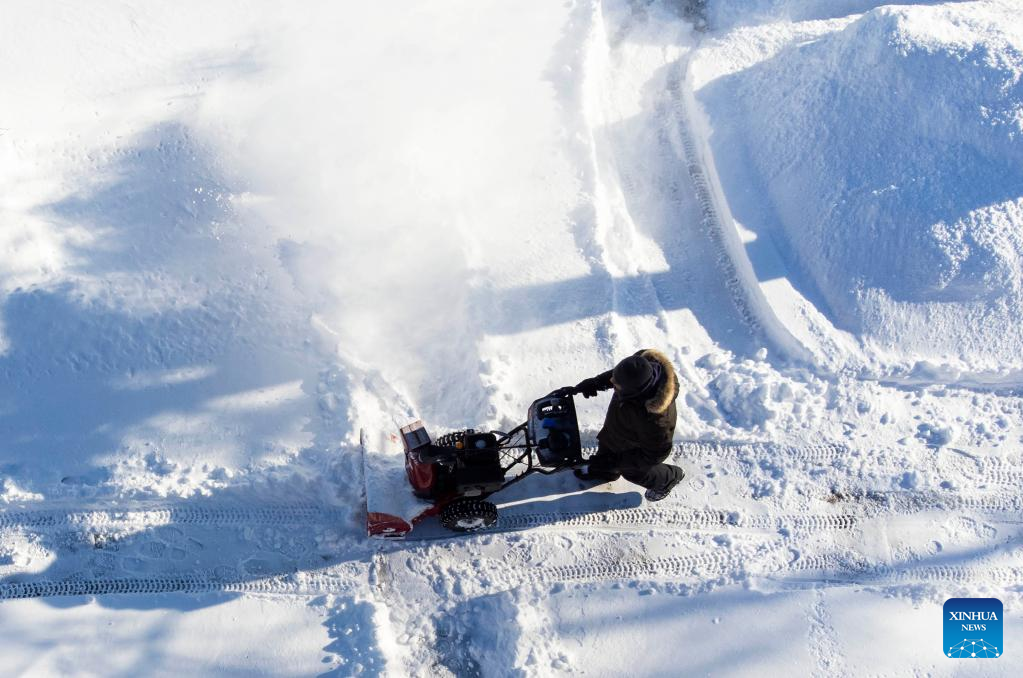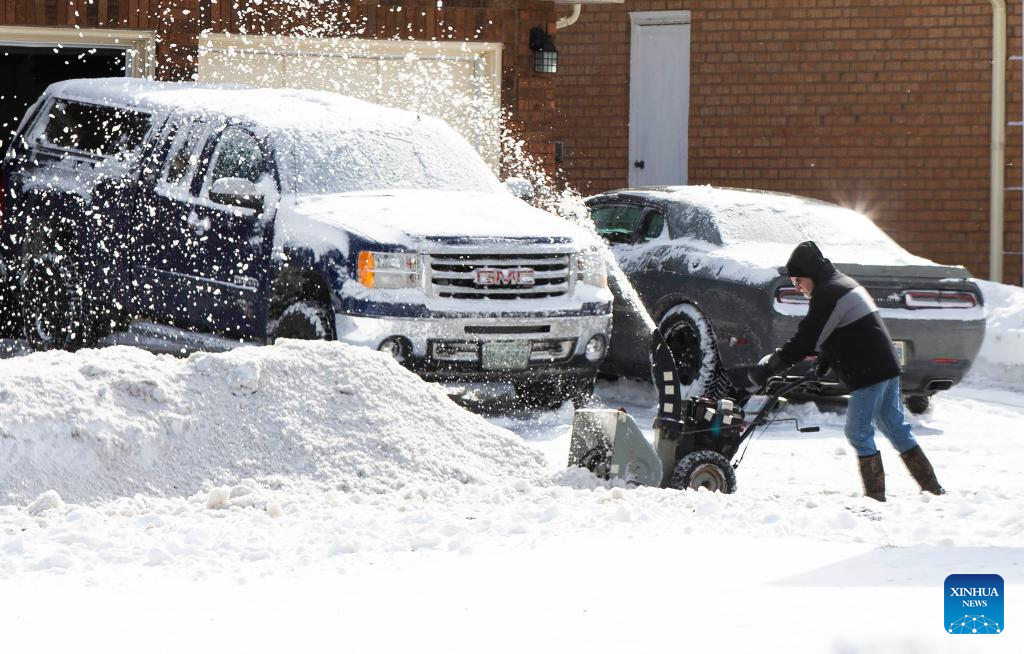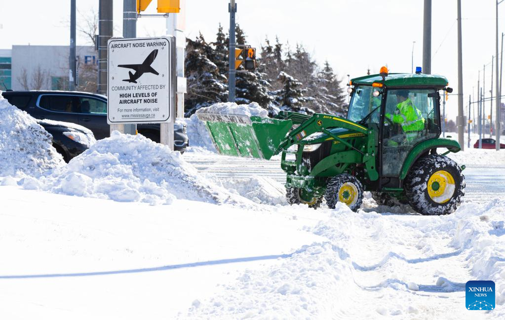 A man clears a sidewalk in Mississauga, the Greater Toronto Area, Canada, on Feb. 18, 2022. The city of Toronto and surrounding areas got a heavy snowfall from Thursday afternoon to Friday morning. (Photo by Zou Zheng/Xinhua)